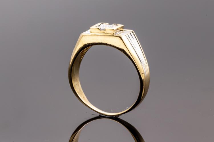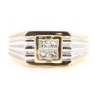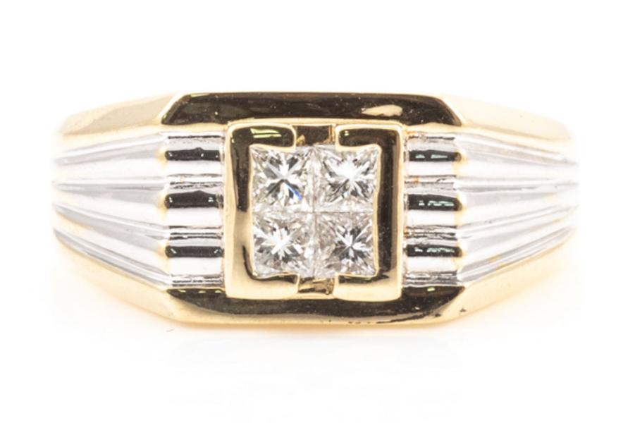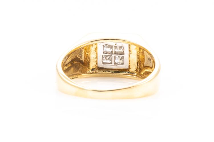 Diamond mens ring with 4 princess cut natural Diamonds totalling approximately 0.40ct (Estimated grading: H-I SI). 18ct yellow gold and white gold. Ring size W1/2 - ring resizing is not recommended. Weight: 10.1g. (Pre-owned)^