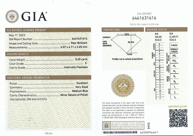 A loose pear shape Natural Diamond of 0.40ct (with GIA summary report graded as E Internally Flawless # 6461631616). (New)