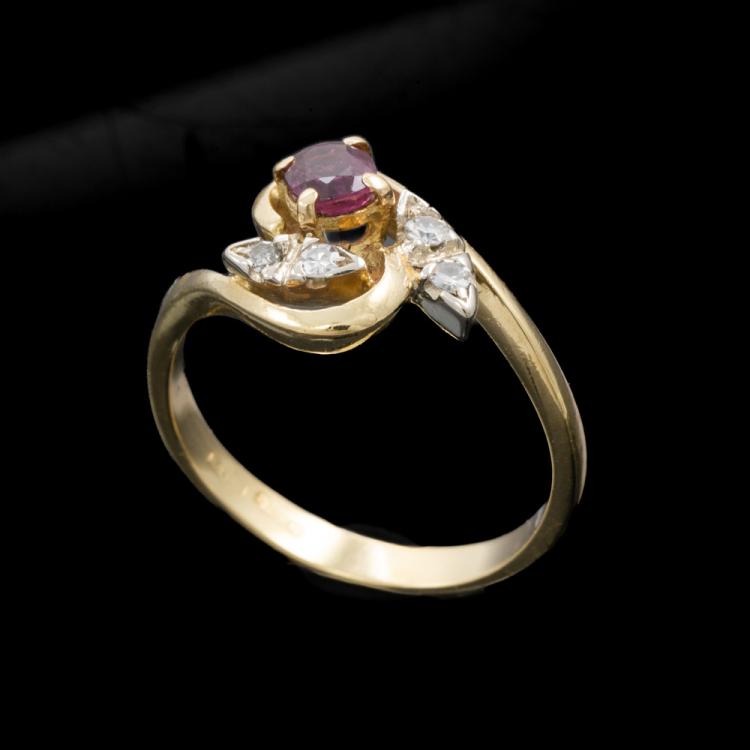 Ruby and Diamond ring with an oval shape Natural Ruby of approximately 0.40ct (note - Ruby with slight surface wear) and 4 round Natural Diamonds totalling approximately 0.12cts. 18ct yellow gold. Ring size M. Band width: 2.5mm-1.3mm. Weight: 3.5g. (Pre-owned)