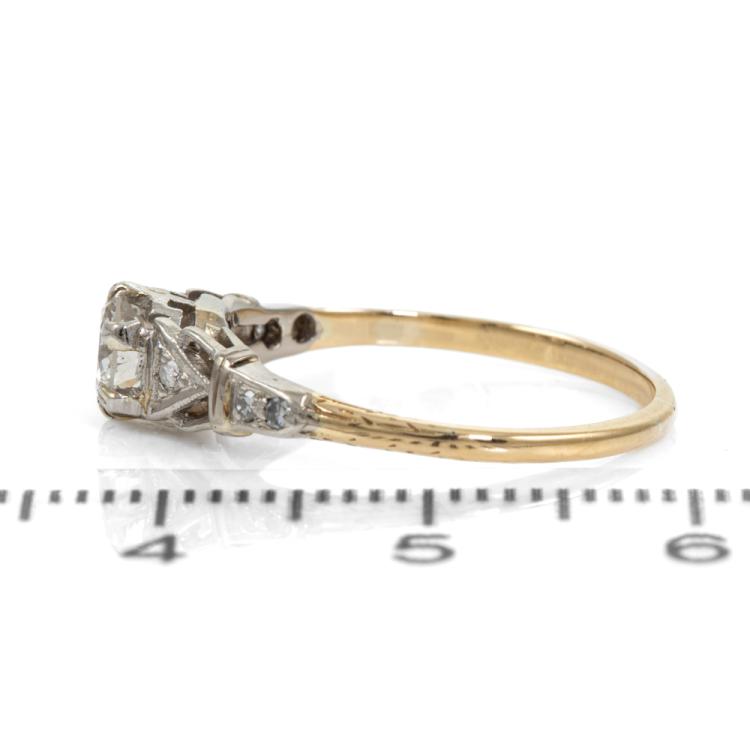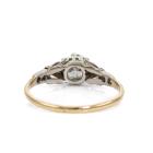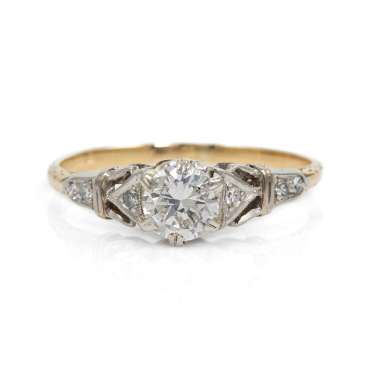 Diamond dress ring with a centre round natural Diamond of approximately 0.50ct (Estimated grading: G-H VS2) and surrounding round natural Diamonds totalling approximately 0.04cts. 18ct yellow and white gold. Ring size L. Weight: 2.1g. (Pre-owned)