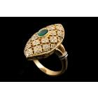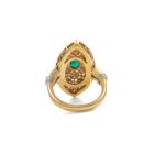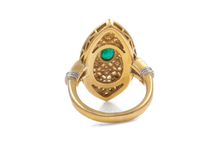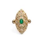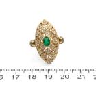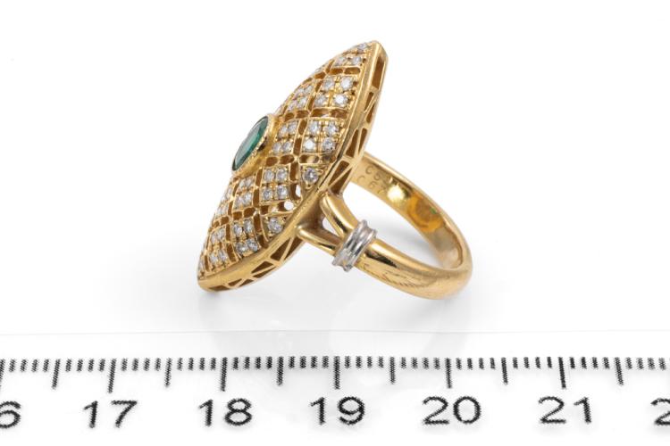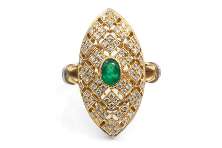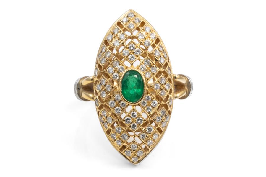 Emerald and Diamond ring (30.mm x 15.0mm) with oval Natural Emerald totalling 0.50ct and round Natural Diamonds totalling 0.67ct (Estimated grading: G-H SI). Platinum 900 and 18ct yellow gold. Ring size L. Band width: 3.1mm - 3.3mm. Weight: 10.5g. (Pre-owned)