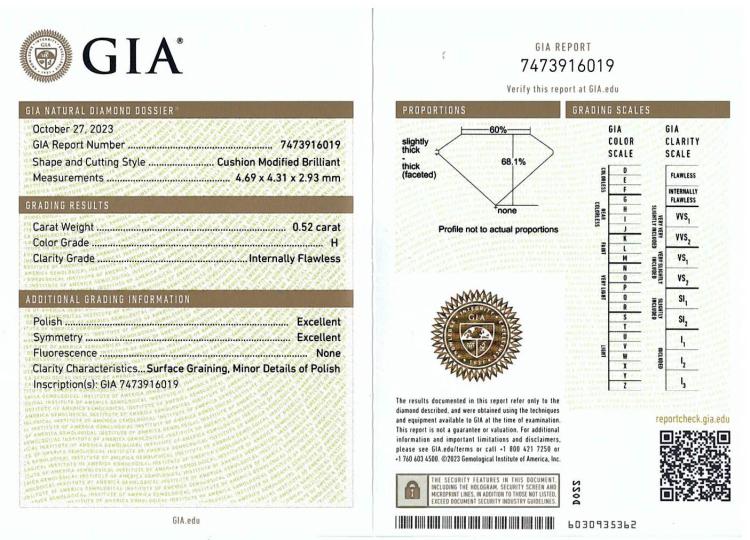 A loose cushion cut Natural Diamond of 0.52ct (with GIA summary report graded as H Internally Flawless # 7473916019