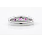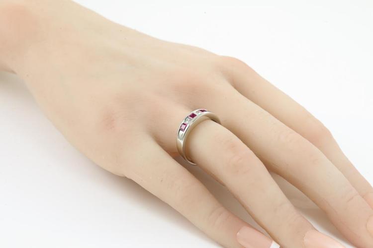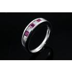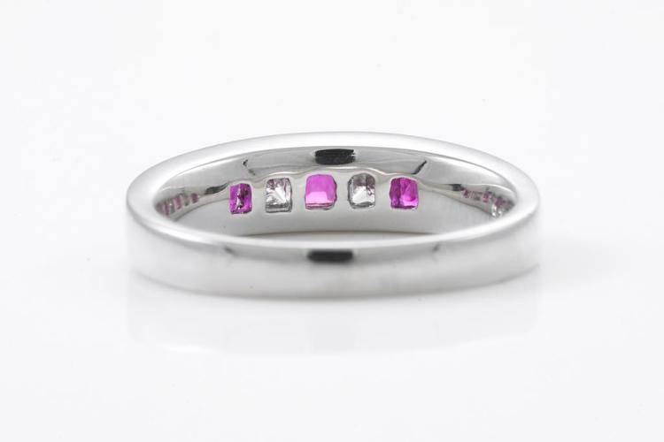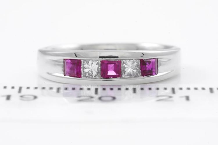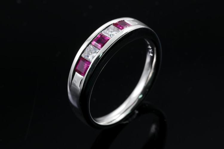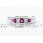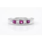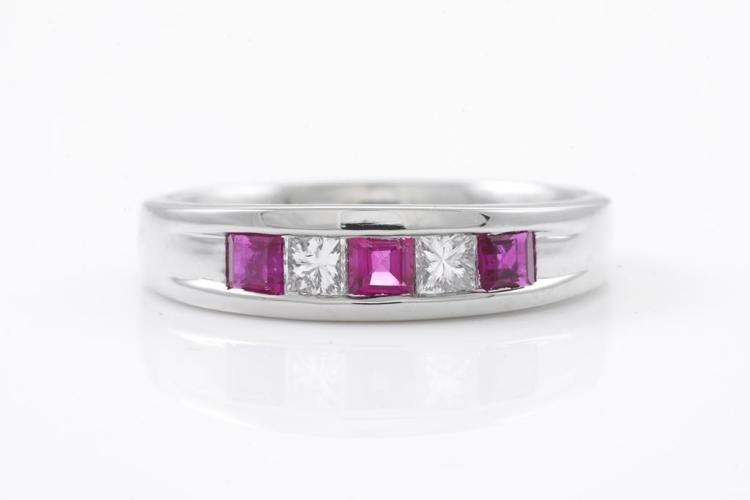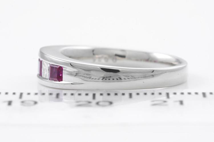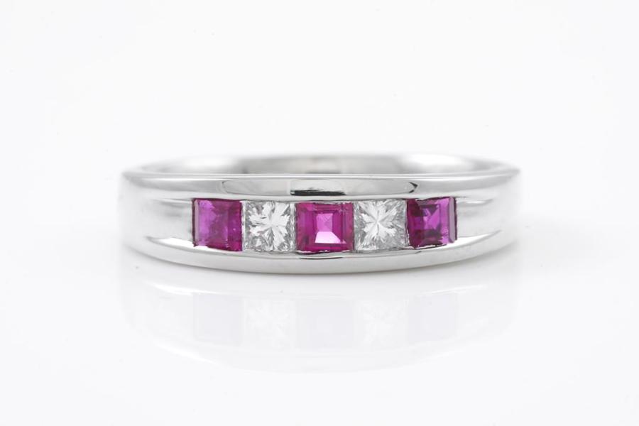 Ruby and Diamond ring with 3 carre cut Rubies totalling 0.53ct and 2 princess cut Diamonds totalling 0.25ct. Platinum. Ring size L1/2 - ring resizing is not recommended. Weight: 7.4g. (Pre-owned)^