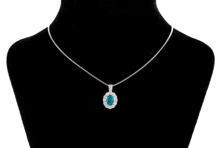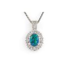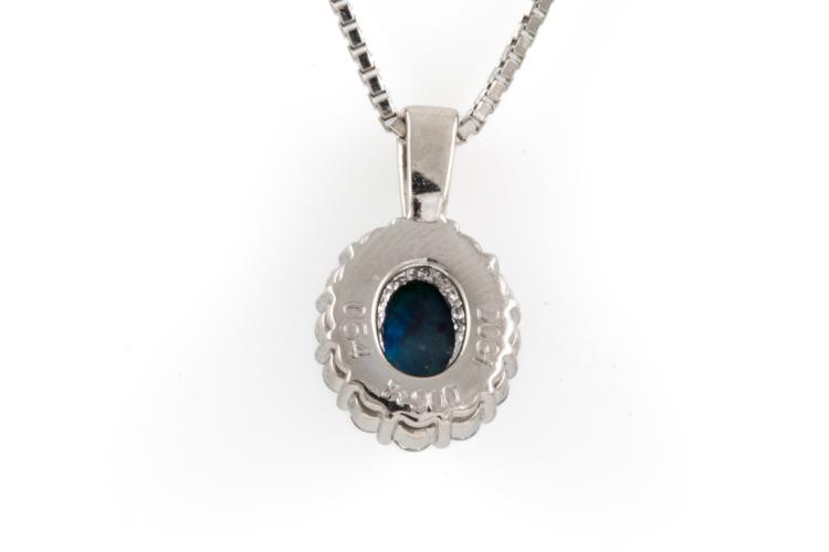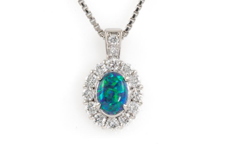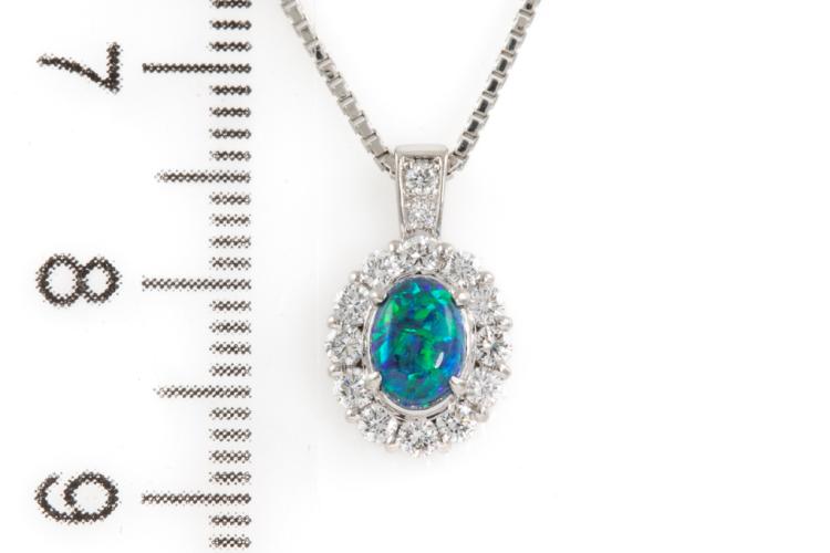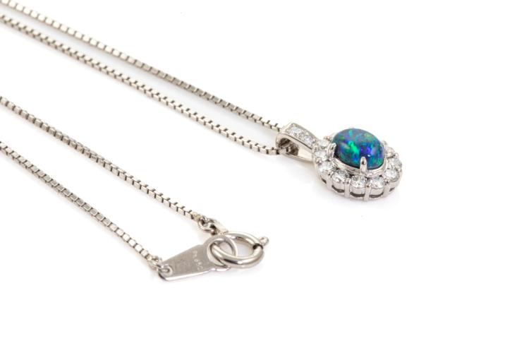 Opal and Diamond pendant with cabochon oval cut solid black Natural Opal of 0.54ct and Natural Diamonds totalling 0.31cts (Estimated grading: G-H SI). Platinum-900 with Platinum-850 39cm chain. Weight 4.9g. (Pre-owned)