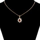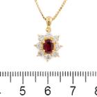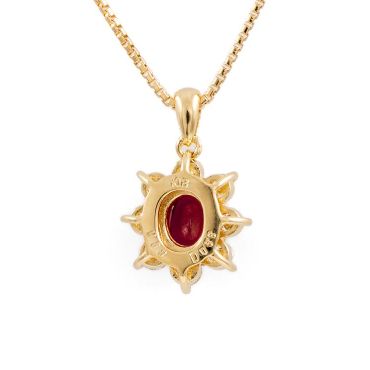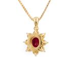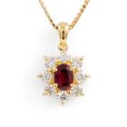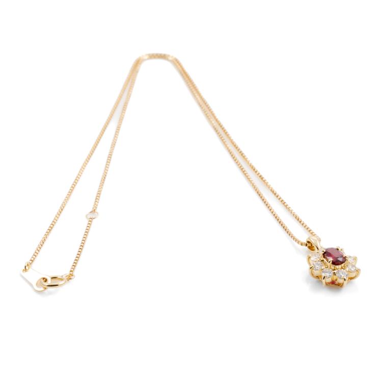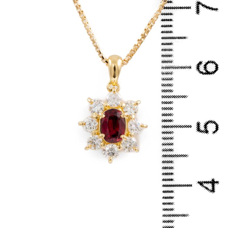 Ruby and Diamond pendant with oval shape Natural Ruby of 0.58ct (Note - Ruby with minor wear marks)and round Natural Diamonds totalling 0.56cts (Estimated grading : G-H SI). 18ct yellow gold with 40cm 18ct yellow gold chain. Weight: 5.1g. (Pre-owned)
