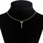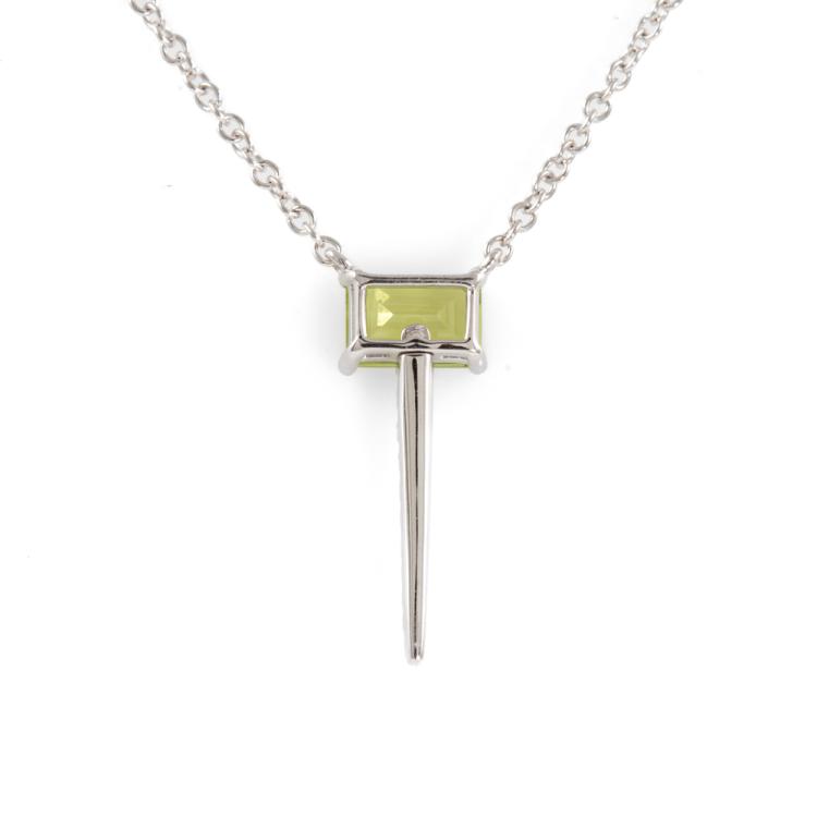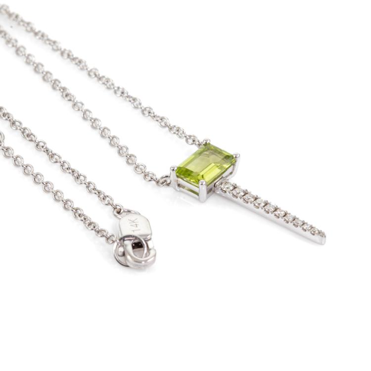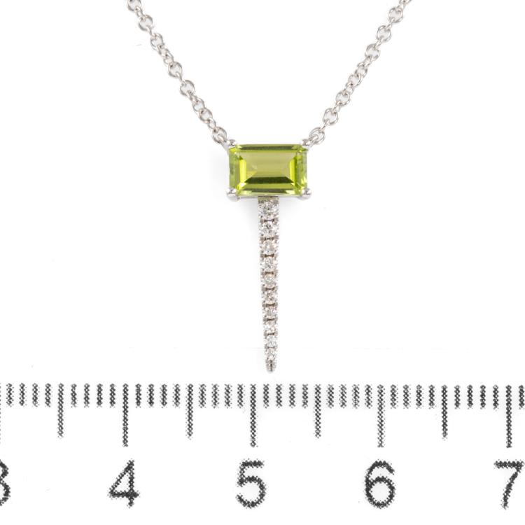 Peridot and Diamond pendant with emerald cut Natural Peridot of 0.59ct and round Natural Diamonds totalling 0.08cts. 14ct white gold attached with 14ct white gold adjustable chain. Length: 46cm. Weight: 2.5g. (New)