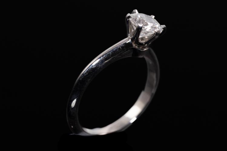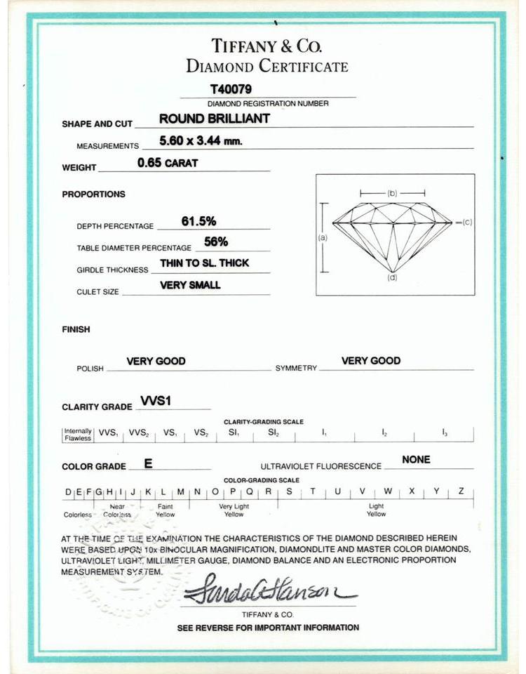Tiffany & Co. Solitaire ring with round brilliant cut Natural Diamond 0.65ct (with Tiffany & Co. certificate graded as E VVS1). Platinum 950. Ring size G - ring resizing is not recommended. Weight: 3.5g. With Tiffany & Co. Certificate and Box. (Pre-owned)