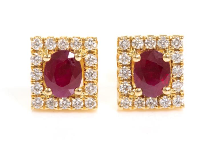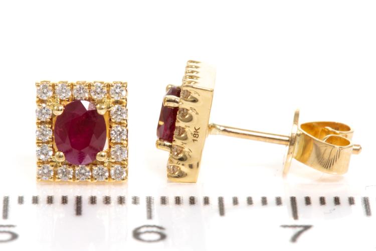 Ruby and Diamond earrings with oval Rubies totalling 0.78cts and Diamonds totalling 0.21cts. 18ct yellow gold. Weight: 2.8g. (New)