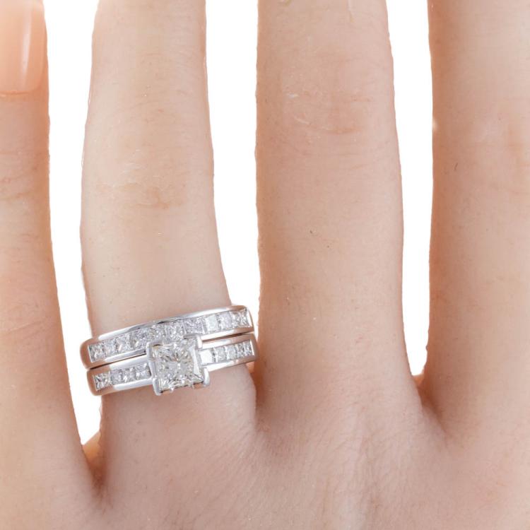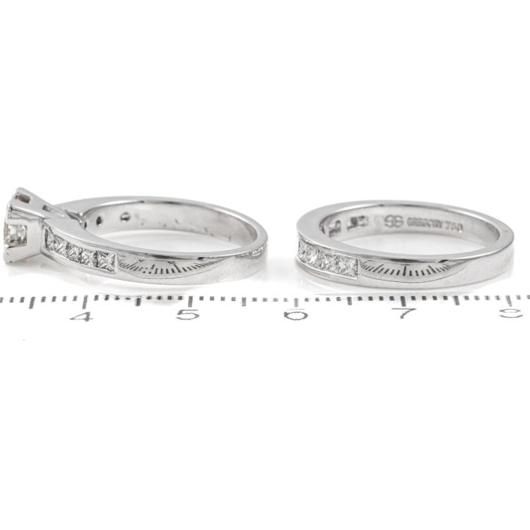 Diamond engagement ring set. Diamond solitaire ring with princess cut Natural Diamond of 0.80ct (Estimated grading: H VS) and round Natural Diamonds totalling approximately 0.40cts (Estimated grading: H SI), Ring size: N, Band width: 3.4mm - 2.8mm. And Gregory eternity ring with 11 princess cut Natural Diamonds totalling 0.44cts (Estimated grading: H SI), Ring size: N 1/4, Band width: 3.2mm - 2.7mm. Both 18ct white gold. Total weight: 10.8g. (Pre-Owned)