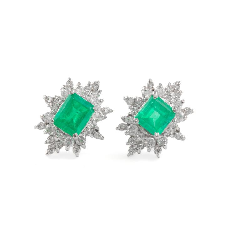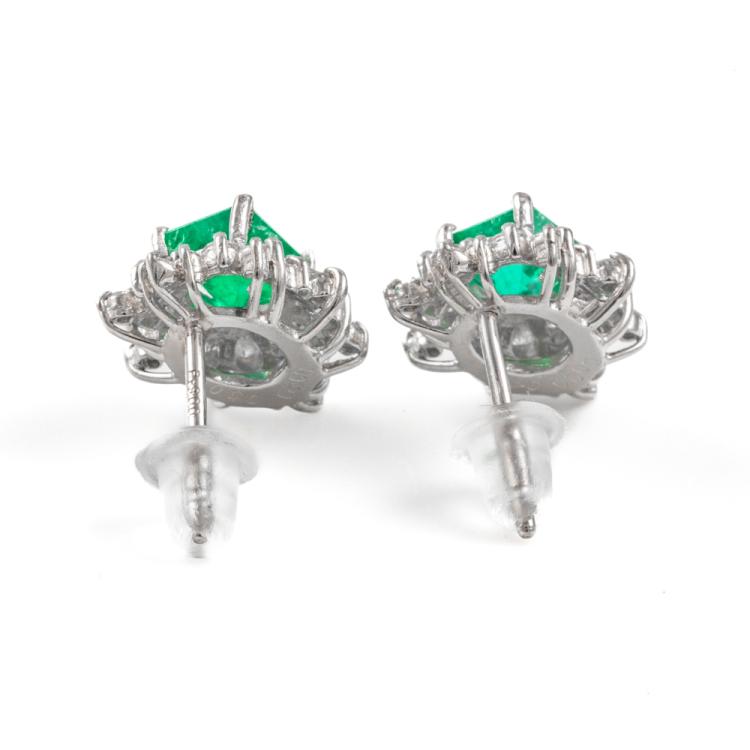 Emerald and Diamond earrings with emerald cut Natural Emerald totalling 0.93cts and Natural Diamonds totalling 0.40cts (Estimated grading:G-H P1). Platinum 900 with silicon backs. Weight: 3.1g. (Pre-owned)