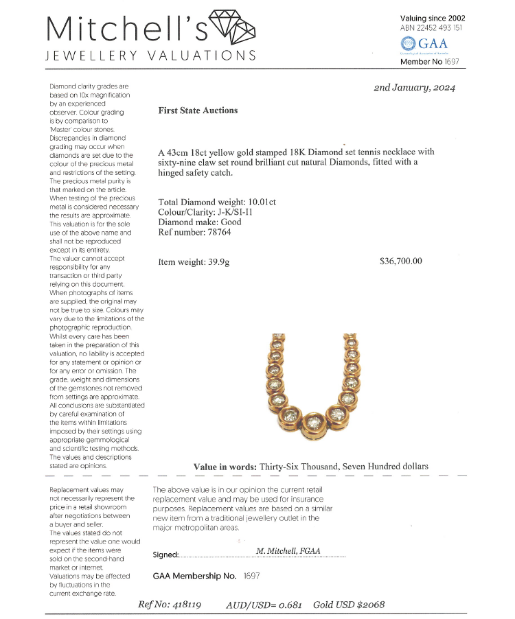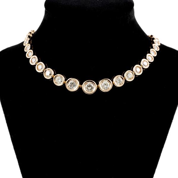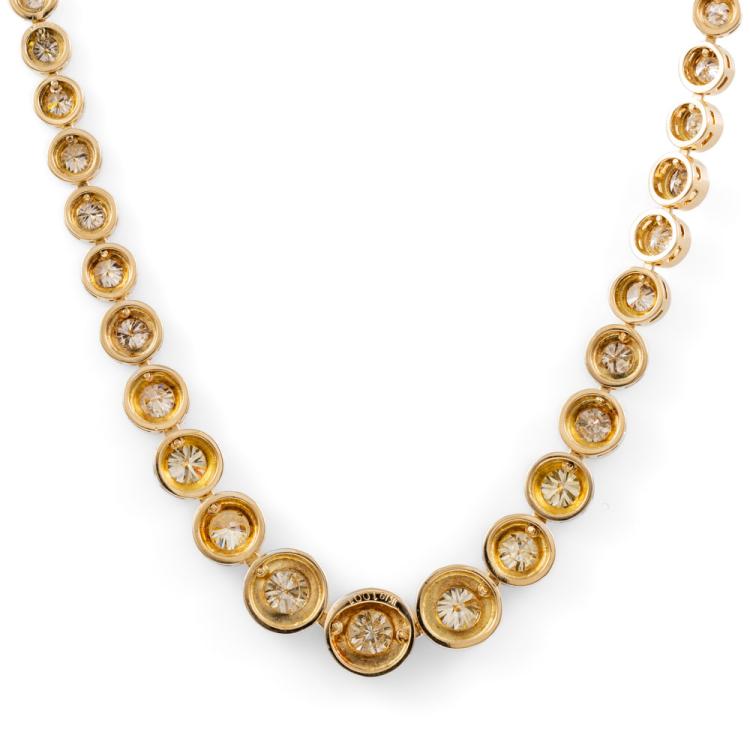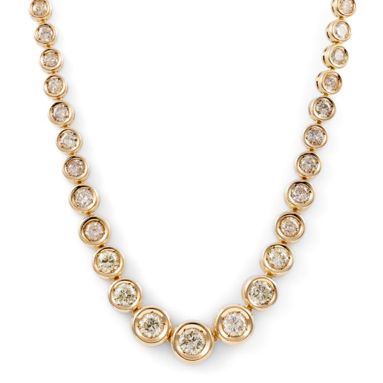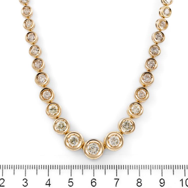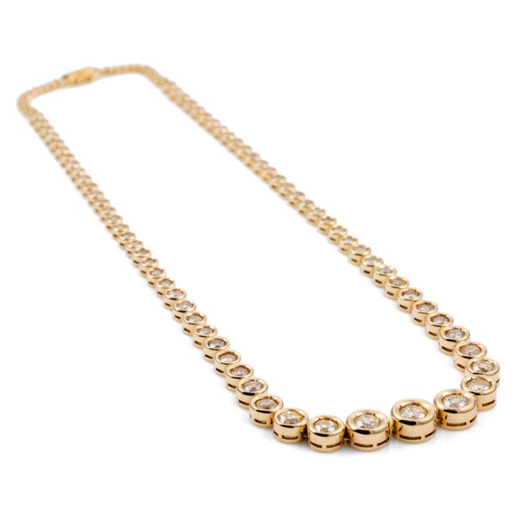Diamond tennis necklace with round graduated Natural Diamonds totalling 10.01cts (Estimated grading: J-K SI-I1). 18ct yellow gold. Length: 43cm. Weight: 39.9g. With Certificate #418119. (Pre-owned)