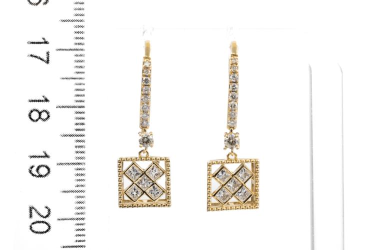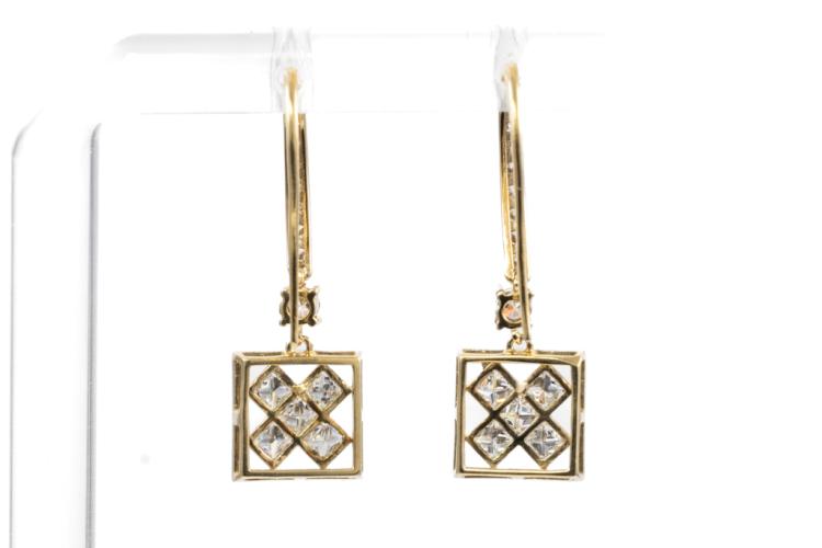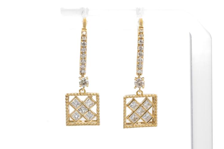 Diamond shepherd hook earrings with princess cut and round Natural Diamonds totalling 1.00cts (Estimated grading: H SI). 18ct yellow gold. Weight: 2.9g. (Pre-owned)