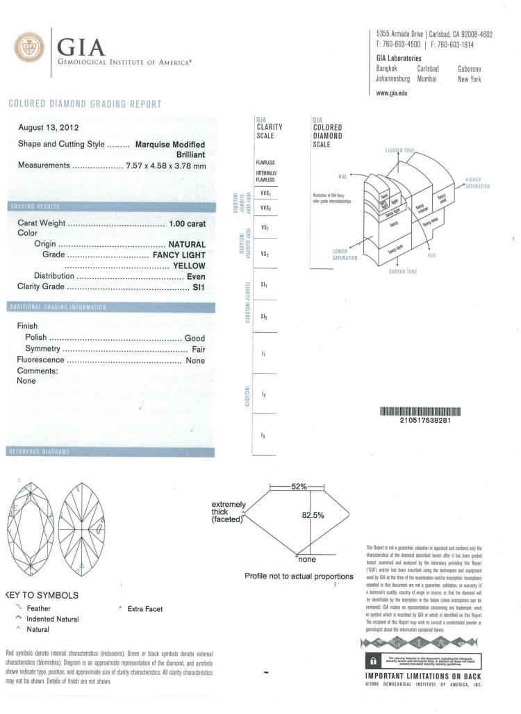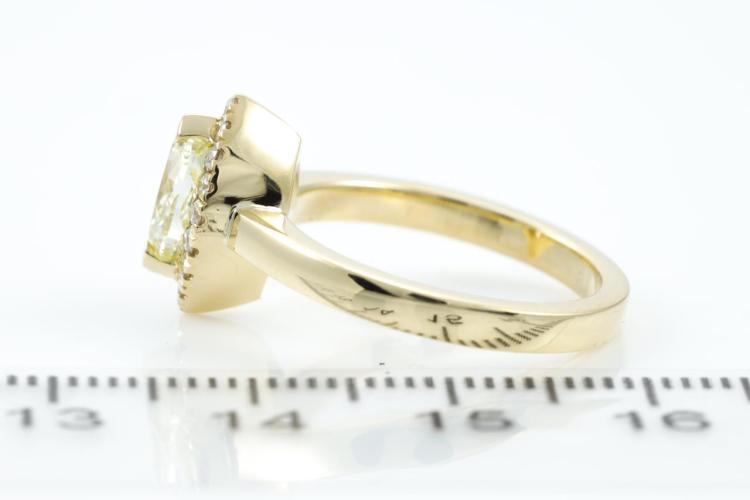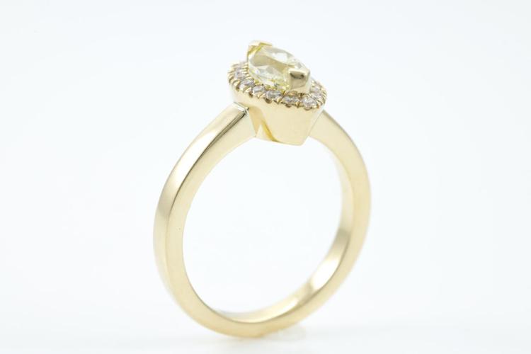 Diamond halo ring with centre marquise cut Natural Diamond of 1.00ct (with GIA report graded as Natural Fancy Light Yellow Even SI1 #1142899152) and surrounding round Diamonds totalling 0.21cts. 18ct yellow gold. Ring size L1/2. Weight 6.0g. (New)