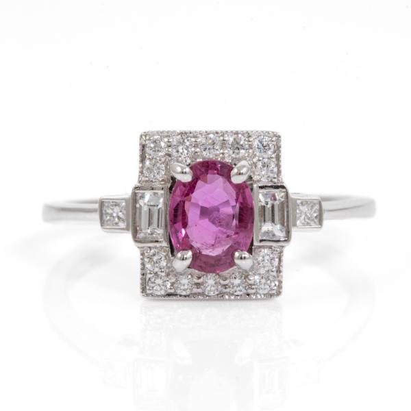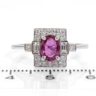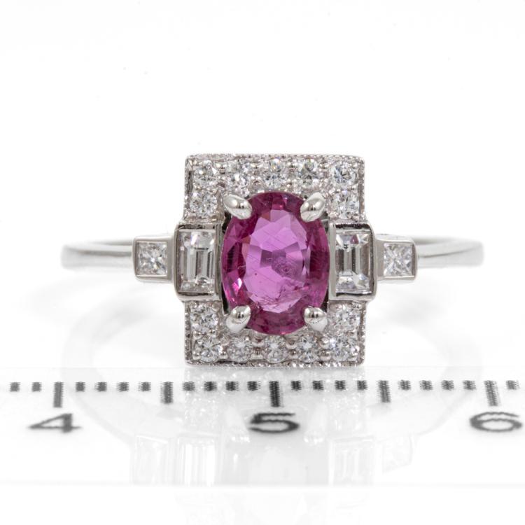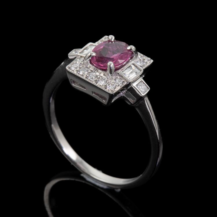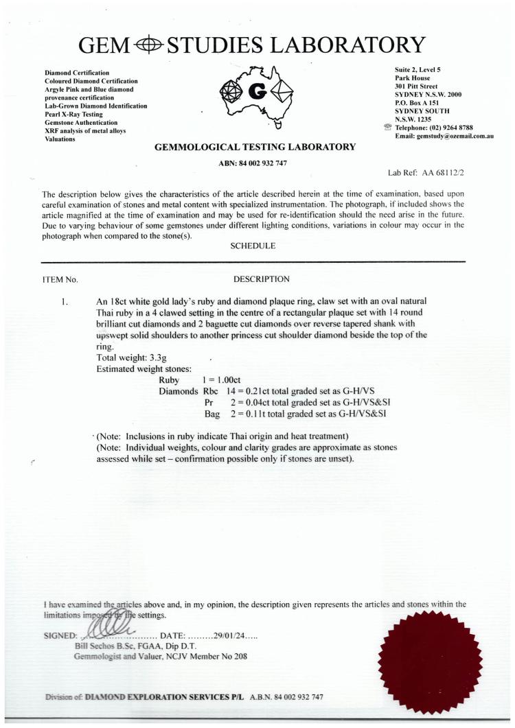 Ruby and Diamond ring with an oval shape Thai Natural Ruby of 1.00ct and round, princess & baguette cut Natural Diamonds totalling 0.36cts (Estimated grading: G-H VS-SI). 18ct white gold. Ring size N1/2. Band width: 1.0mm-1.5mm. Weight: 3.3g. With GSL Certificate #AA 68112/2. (As new)