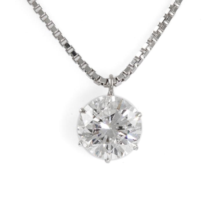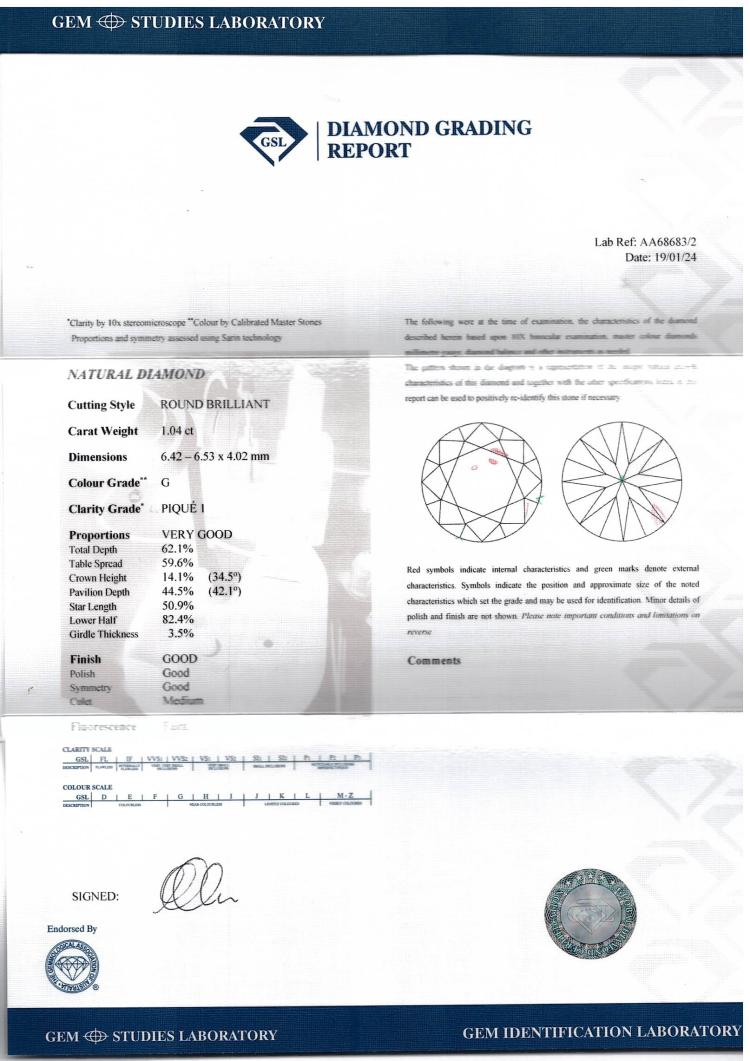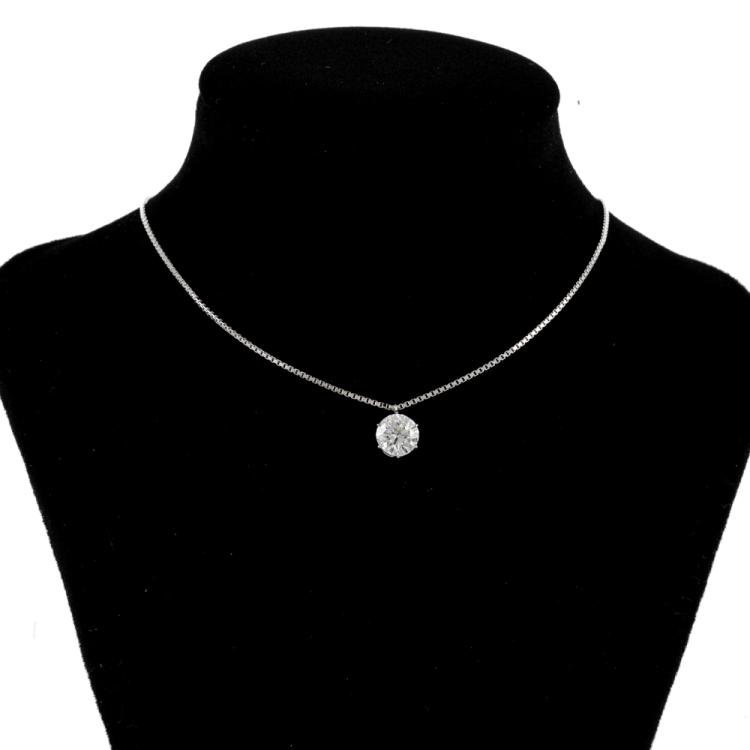 Diamond solitaire pendant with round brilliant cut Natural Diamond of 1.04cts (GSL Report graded as G P1 # 68653/2). Platinum 900 with 44cm platinum 850 chain. Weight: 4.1g. (Pre-owned)
