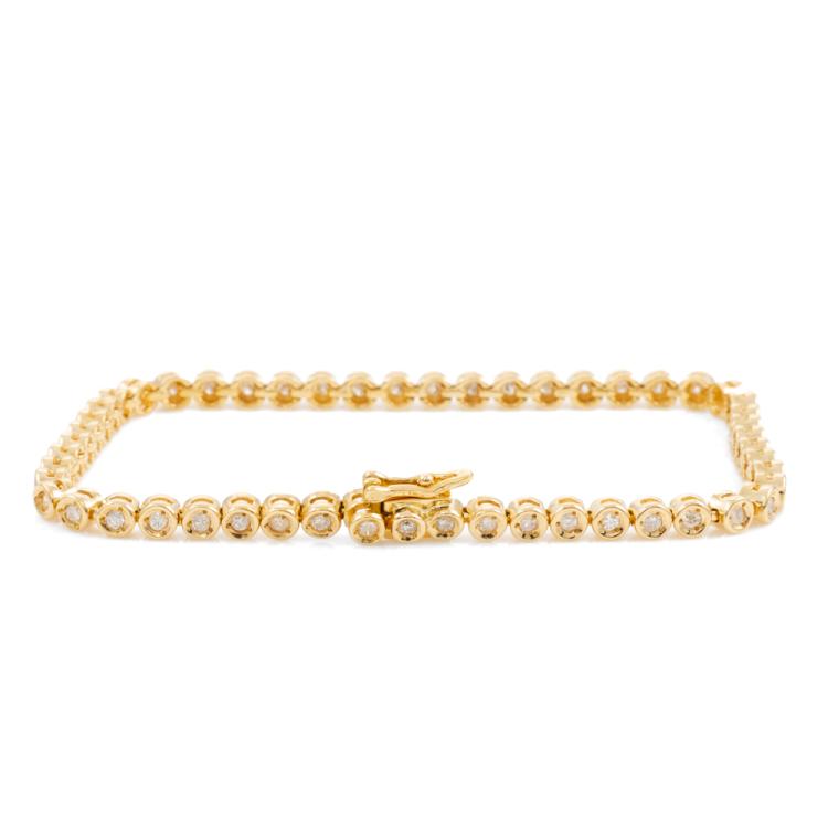 Diamond tennis bracelet with 42 round natural Diamonds totalling 1.05cts (Estimated grading: I-J SI-P1). 18ct yellow gold. Length: 18cm. Weight: 10.9g. (Pre-owned)