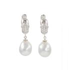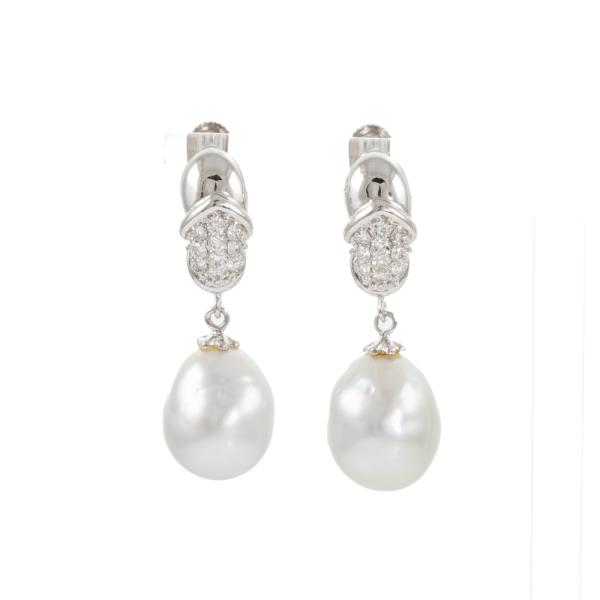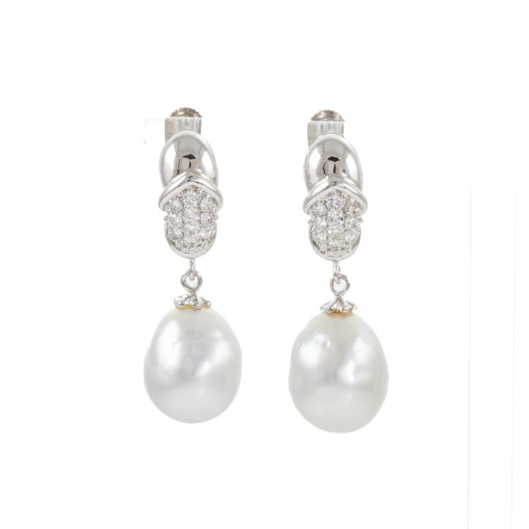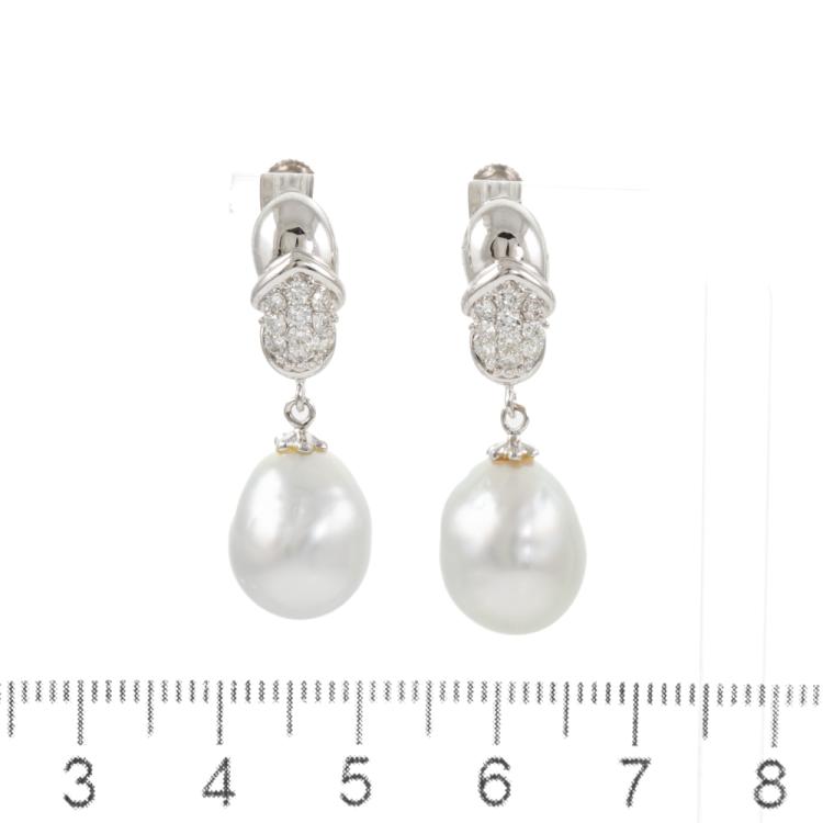 Pearl and Diamond clip-on screwback (no posts) drop earrings with South Sea Pearls of 10.5mm and round Natural Diamonds totalling 0.40cts (Estimated grading: H SI-P1). 18ct white gold. Weight: 8.2g. (Pre-owned)