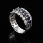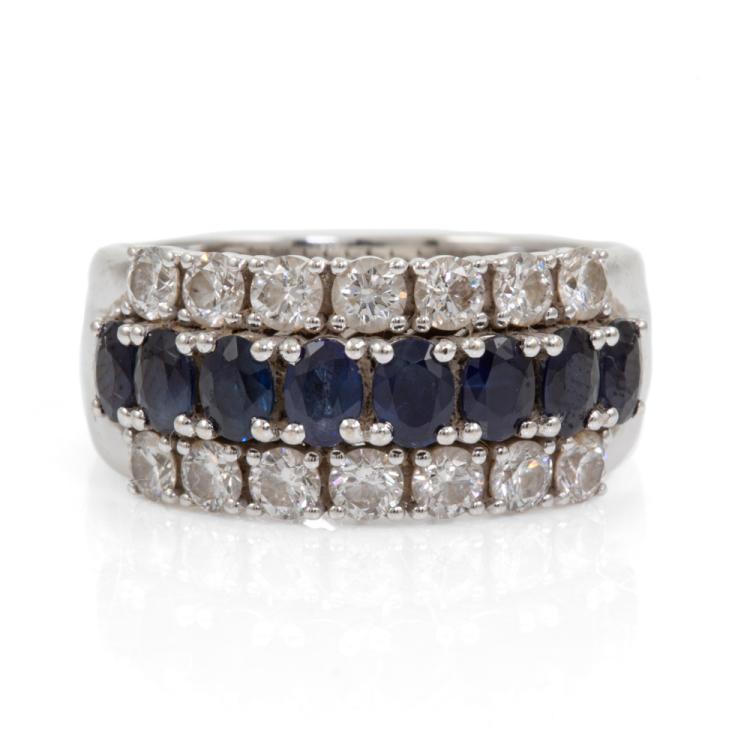 Sapphire and Diamond ring with 8 oval shape natural blue Sapphires totalling approximately 1.10cts and round Natural Diamonds totalling approximately 1.10cts (Estimated grading: H-I SI). 18ct white gold. Ring size P½. Band width: 6.2mm - 8.5mm. Weight 8.2g. (Pre-owned)