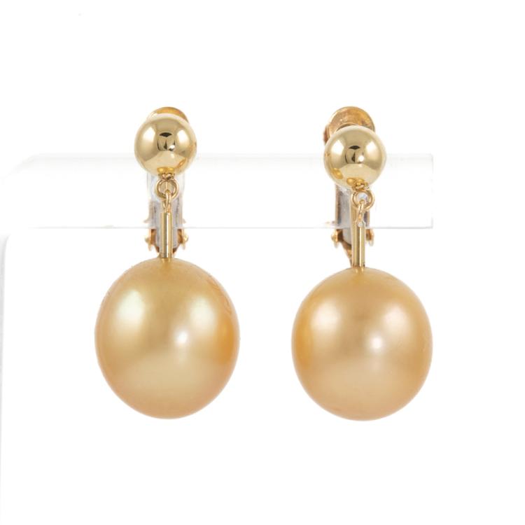 Pearl clip-on screwback earrings with 2 oval shape Golden South Sea Pearls of 11.0mm & 11.3mm. 18ct yellow gold. Weight: 6.4g. (Pre-owned)