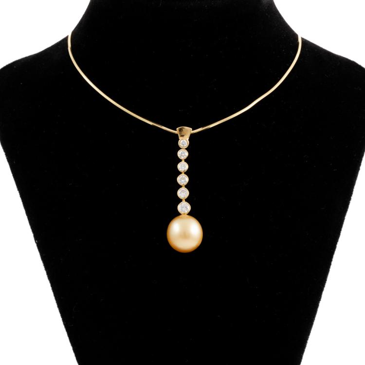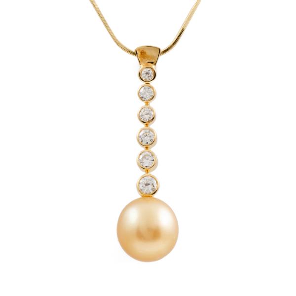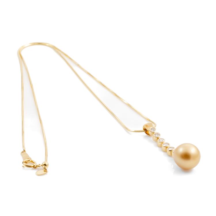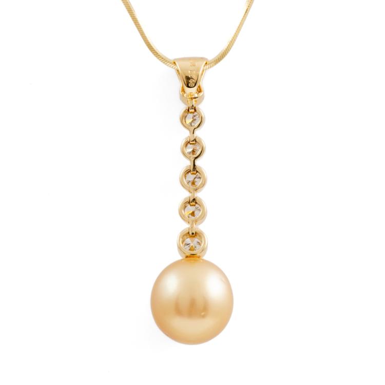 Pearl and Diamond drop pendant with Golden South Sea Pearl of 11.1mm and round Natural Diamonds totalling 0.49cts (Estimated grading: H-I SI ). 18ct yellow gold with 18ct yellow gold adjustable 46cm chain. Weight: 8.5g. (Pre-owned)