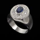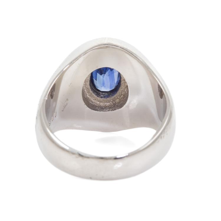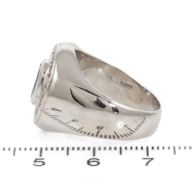 Sapphire and Diamond mens ring with an oval shape natural Sapphire of 1.18ct and round natural Diamonds totalling 0.32ct (Estimated grading: H SI). Platinum 900. Ring size Q. Band width: 4.7mm-10.6mm. Weight: 25.6g. (Pre-owned)