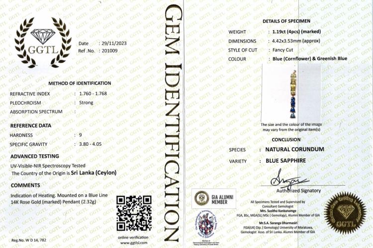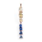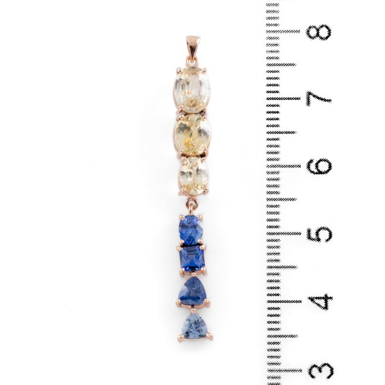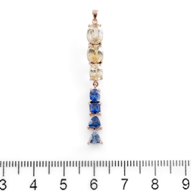 Sapphire pendant with 4 oval, trilliant, emerald cut blue Ceylon Natural Sapphires totalling 1.19cts and 3 oval shape yellow Natural Sapphires totalling 3.05cts. Length: 4.5cm. 14ct rose gold. No chain provided. Weight: 2.3g. With GGTL Report #201009. (As new)
