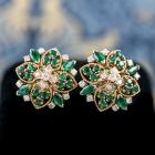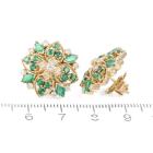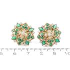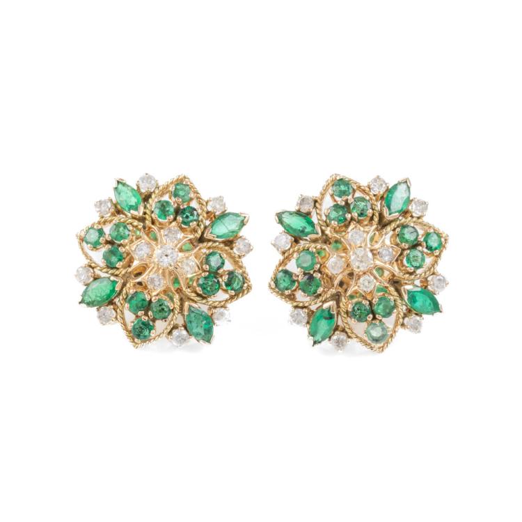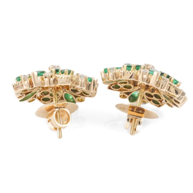 Emerald and Diamond earrings with round & marquise cut Natural Emeralds totalling approximately 1.20cts and round Natural Diamonds totalling approximately 0.80cts (Estimated grading: HIJ P1). 14ct yellow gold with screwbacks (XRF tested, stamped 18ct). Width: 20.3mm. Weight: 9.0g. (Pre-owned)