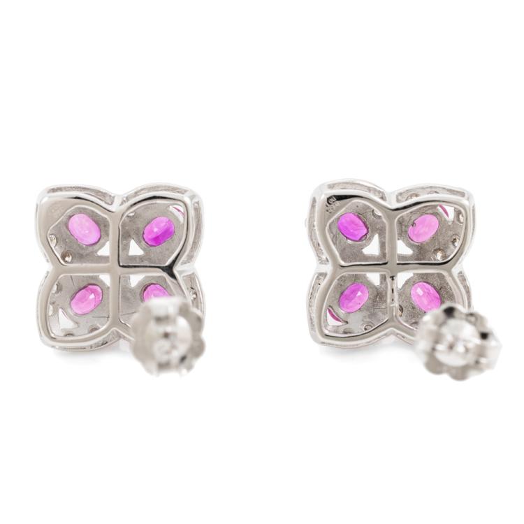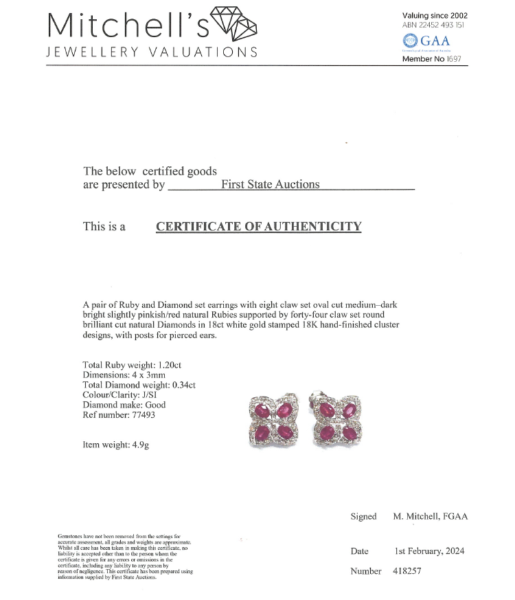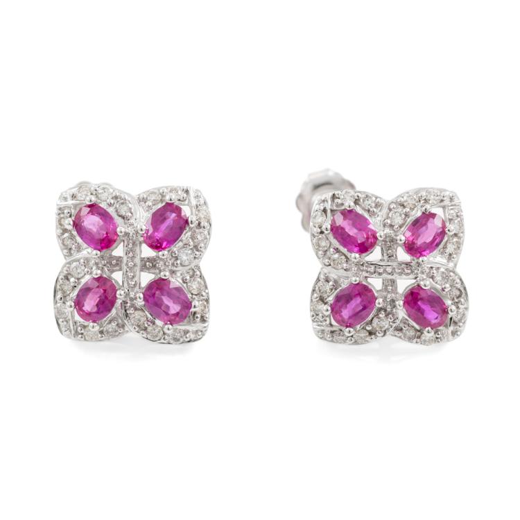 Ruby and Diamond earrings with oval Natural Rubies totalling 1.20cts and round Natural Diamonds totalling 0.34cst (Estimated grading: J SI). 18ct white gold. Weight: 4.9g. With Certificate #418257. (Pre-owned)