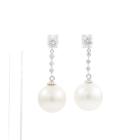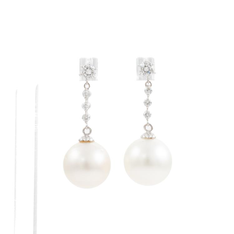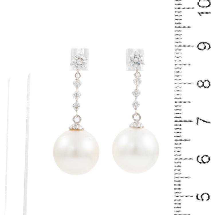 Pearl and Diamond drop earrings with South Sea Pearls of 12.2mm & 12.4mm and round Natural Diamonds totalling 0.43cts (Estimated grading: G SI). Platinum 900 with silicon backs. Weight: 7.2g. (Pre-owned)