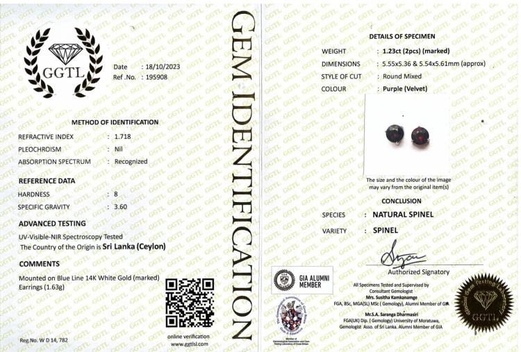 Spinel stud earrings with round dark pinkish purple Ceylon Natural Spinel totalling 1.23ct. 14ct white gold. Weight: 1.6g. With GGTL report #195908. (As new)^