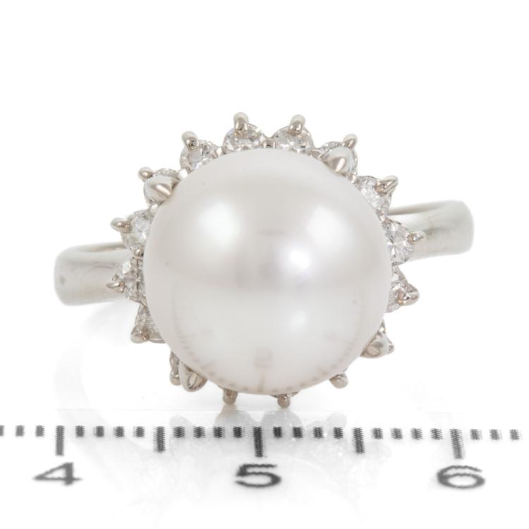 South Sea Pearl and Diamond ring with white South Sea Pearl of 12.4mm and Natural Diamonds totalling 0.66cts (Estimated grading: H-I P1). Platinum 900. Ring size T. Band width: 2.8mm - 2.6mm. Weight: 11.5g. (Pre-owned)