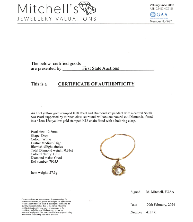 Pearl and Diamond pendant/ enhancer with drop shape and slightly ringed South Sea Natural Pearl of 12.8mm and round Diamonds totalling 0.33cts (Estimated grading: H SI). 18ct yellow gold with 41cm 18ct yellow gold chain. Weight: 27.5g. With Certificate 418351. (Pre-owned)