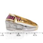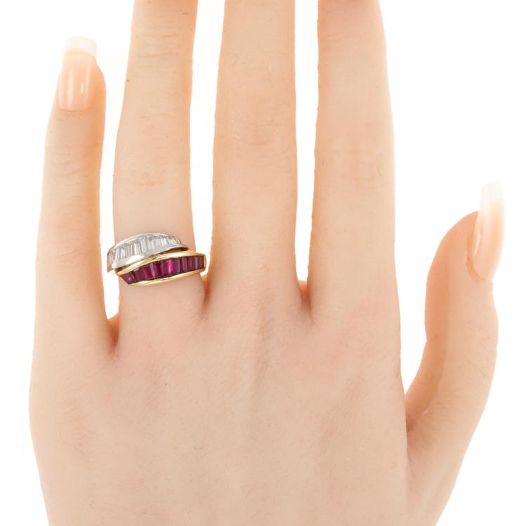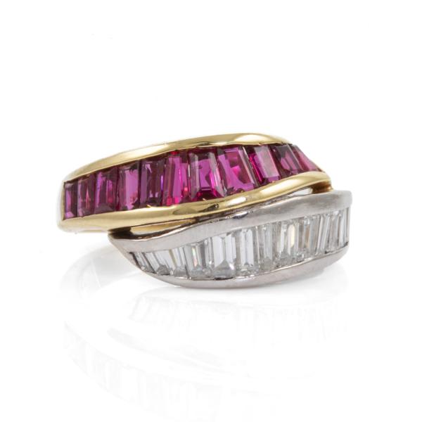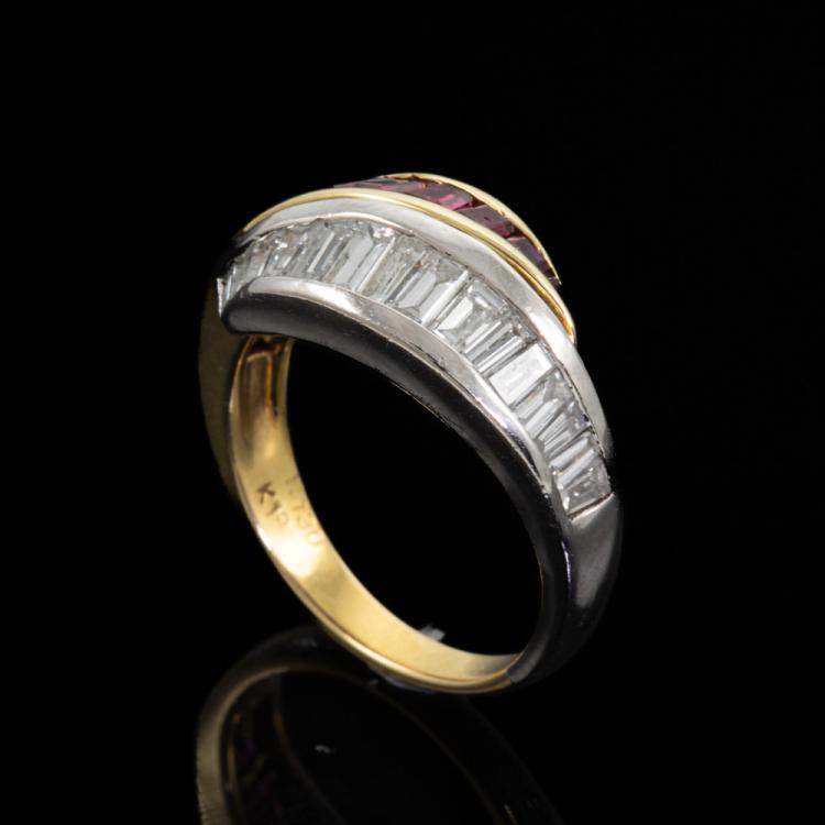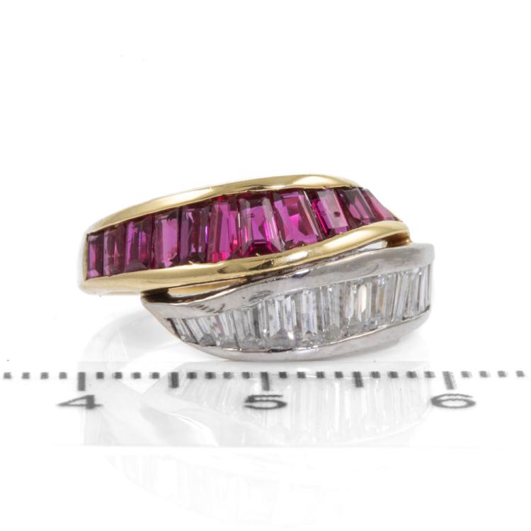 Ruby and Diamond ring with baguette cut Natural Rubies totalling 1.30cts and baguette cut Natural Diamonds totalling 0.84cts (Estimated grading: G-H VS-SI). Platinum 900 and 18ct yellow gold. Ring size L. Band width: 2.5mm - 3.8mm. Weight: 5.9g. Join line between yellow gold and platinum. (Pre-owned)