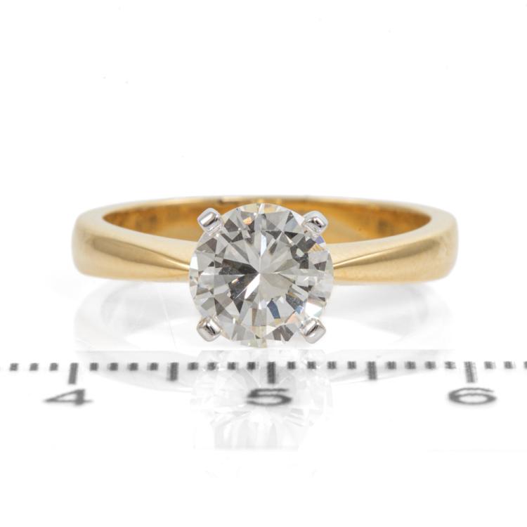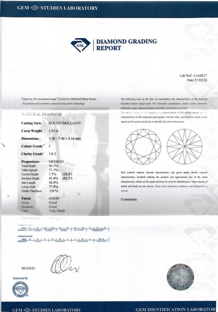 Diamond solitaire ring with round brilliant cut Natural Diamond of 1.35cts (GSL Diamond Report graded as: J VS2 #AA68827). 18ct yellow and white gold. Ring size N. Band width 3.3mm - 2.1mm. Weight: 4.7g.(New)