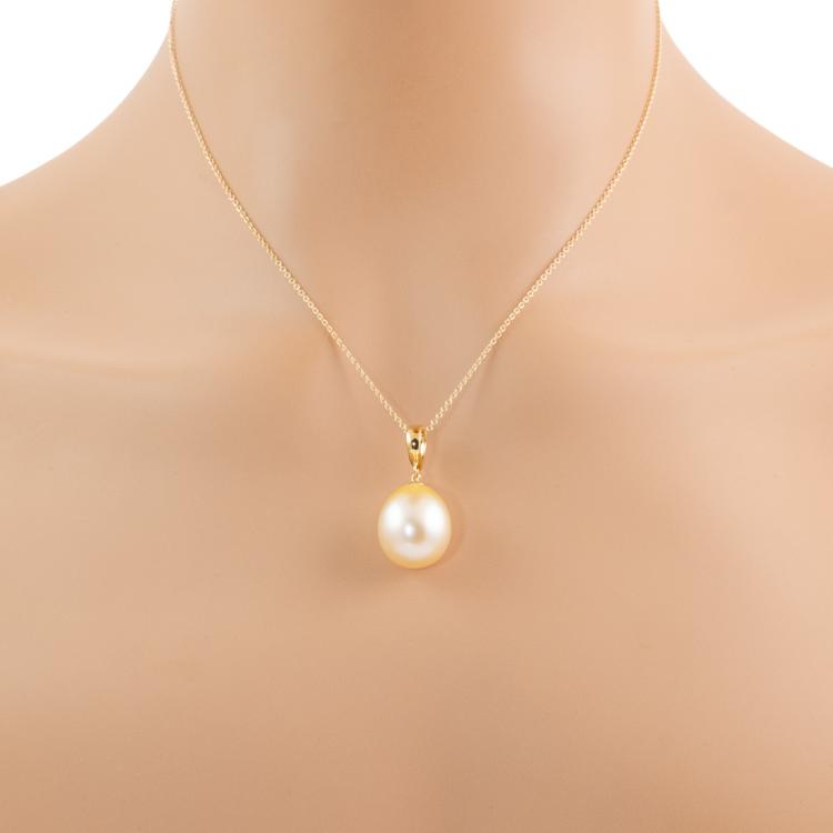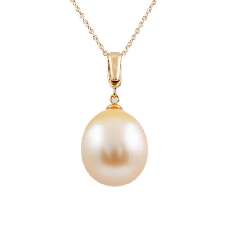 Pearl enhancer pendant with oval shape light golden South Sea Pearl of 13.9mm. 18ct yellow gold with 40cm 14ct yellow gold chain. Weight: 6.2g. (Pre-owned)