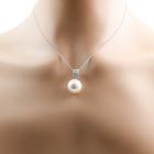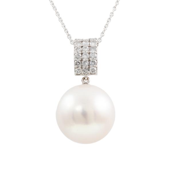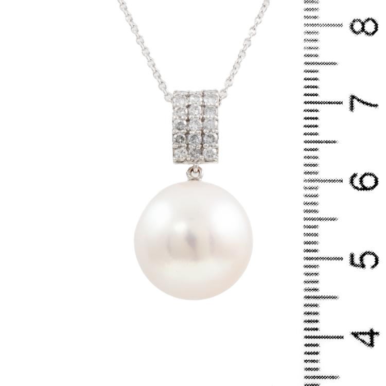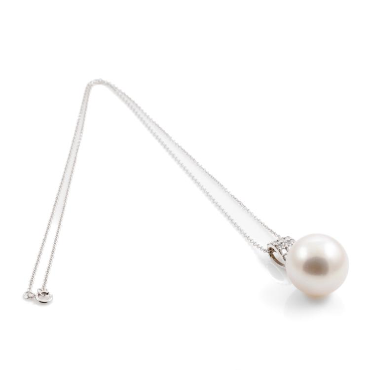 Pearl and Diamond pendant with South Sea Pearl of 14.5mm and natural Diamonds totalling 0.36cts (Estimated grading: H SI). 18ct white gold with 40cm 14ct white gold chain. Weight: 6.9g. (Pre-owned)