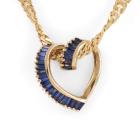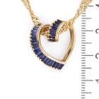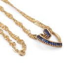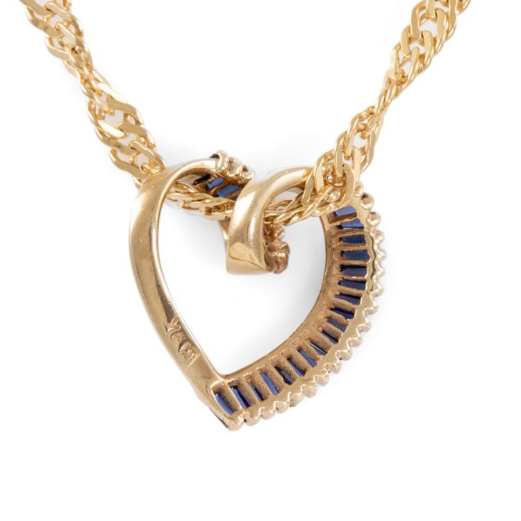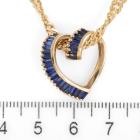 Sapphire pendant with tapered baguette cut dark blue natural Sapphires totalling approximately 1.50cts. 9ct yellow gold with 50cm 9ct yellow gold flat twisted curb link chain. Weight: 11.1g. With copy of GSL valuation #AA 63603, item 4. (Pre-Owned)^