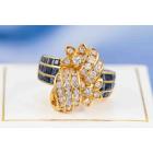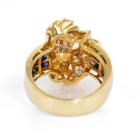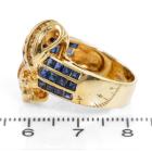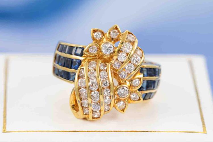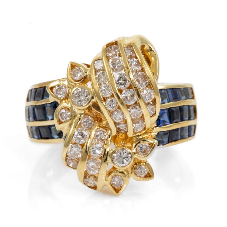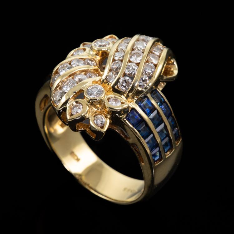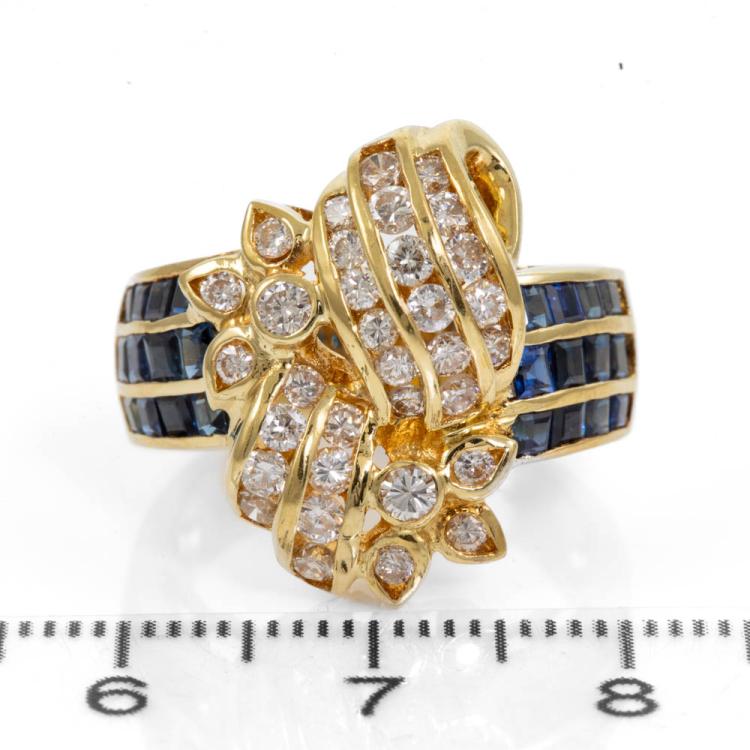 Sapphire and Diamond ring with carre cut blue Natural Sapphire totalling 1.51cts (1 stone small chip) and round Natural Diamonds totalling 0.95cts (Estimated grading: G-H SI, one diamond minor chip). 18ct yellow gold. Ring size M. Band width: 7.0mm - 5.3mm. Weight: 9.6g. (Pre-owned)