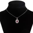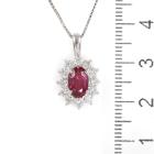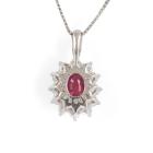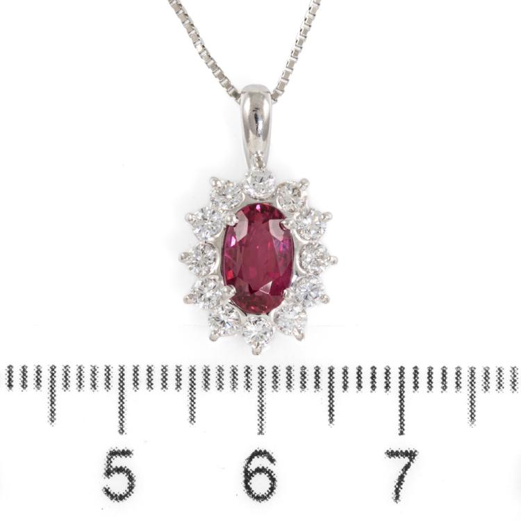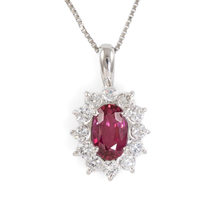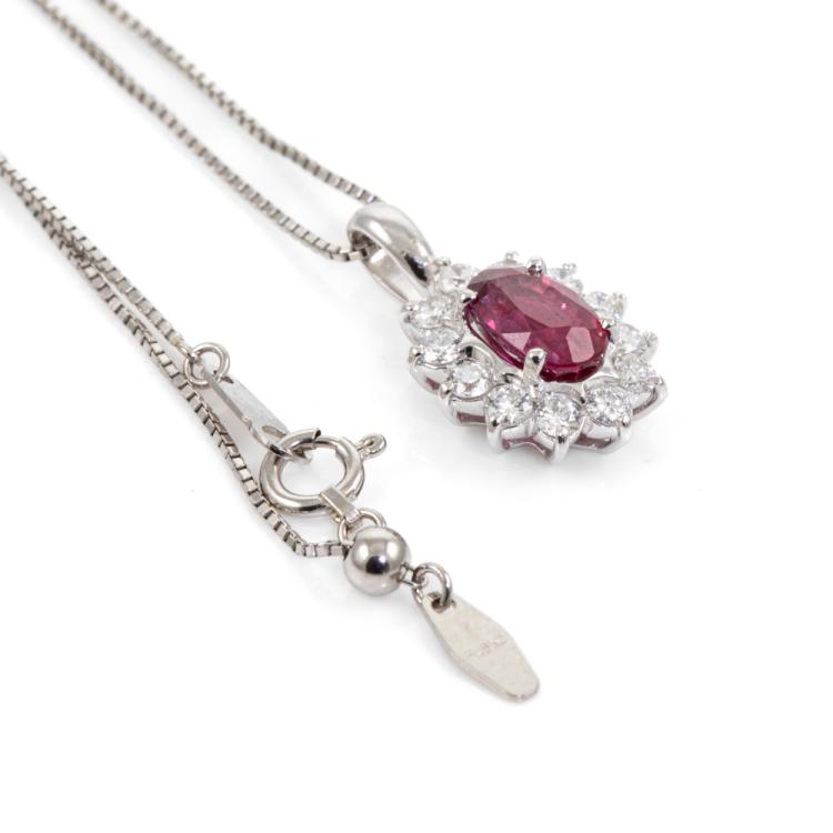 Ruby and Diamond pendant with oval shape Natural Ruby of 1.60ct and Natural Diamonds totalling 0.53cts (Estimated grading: F-G SI). Platinum 900 with Platinum 850 45cm adjustable chain. Weight: 5.4g. (Pre-owned)