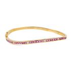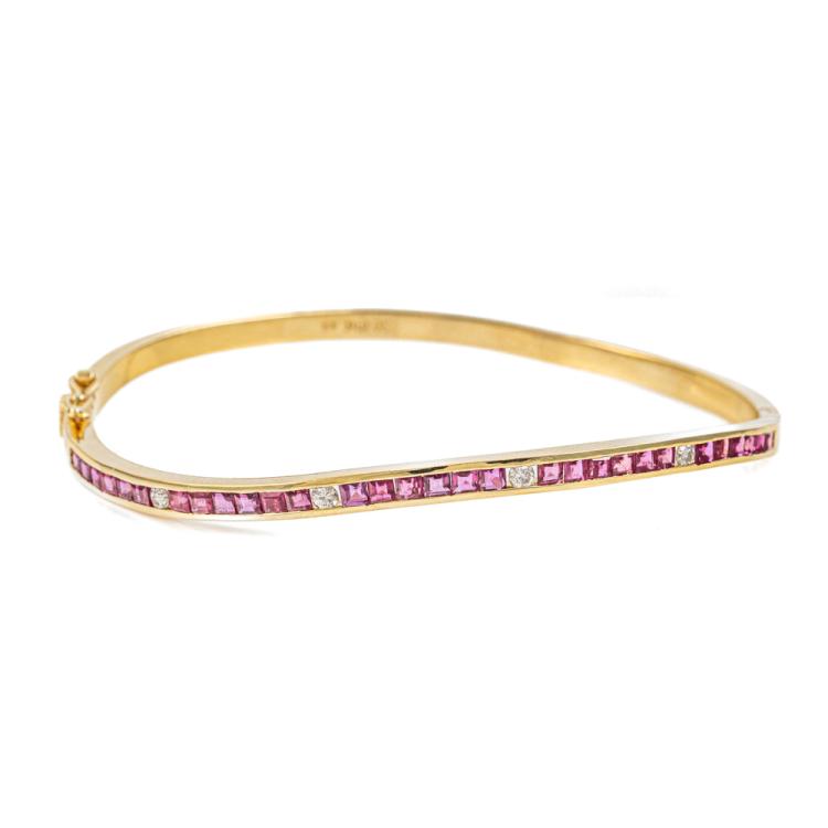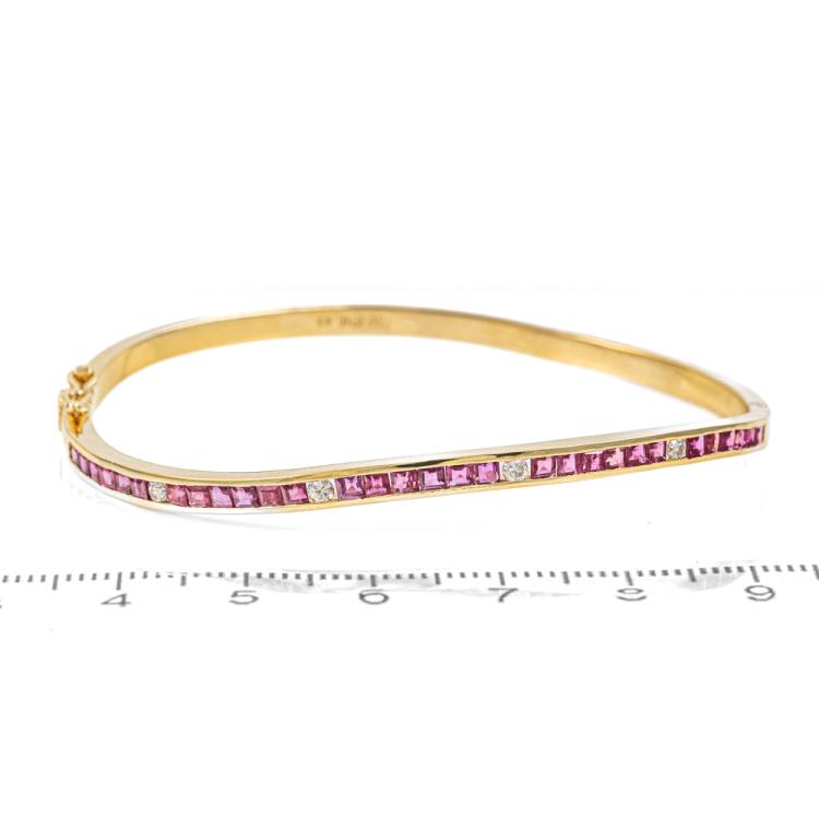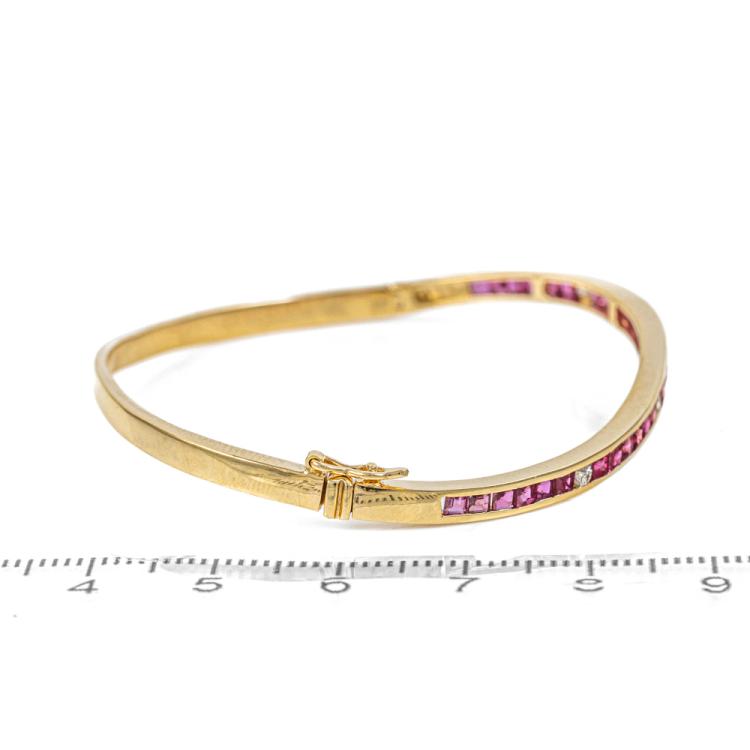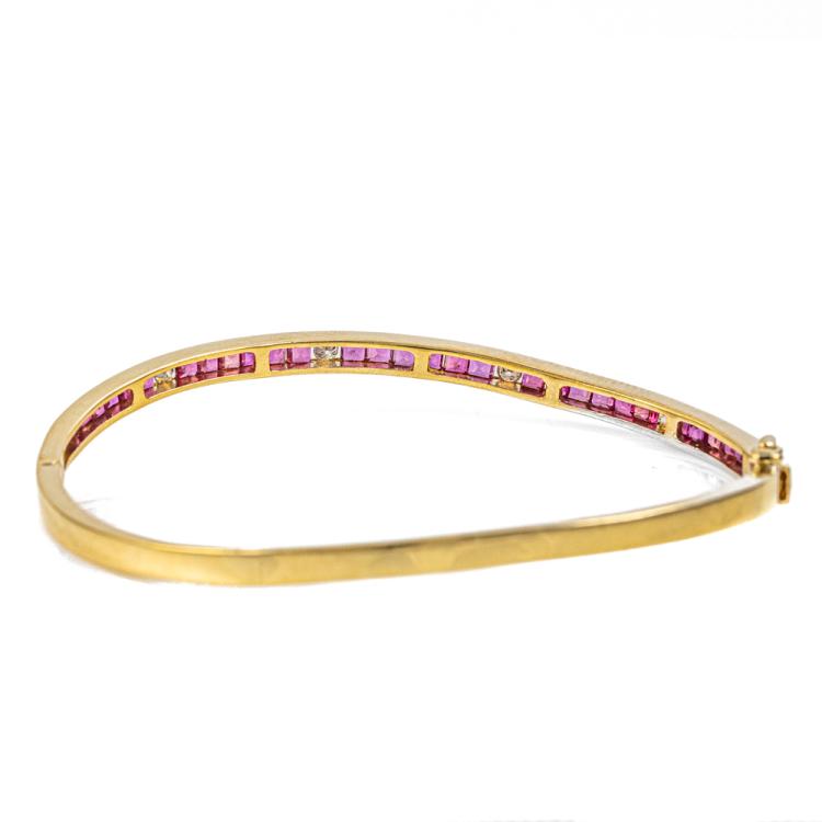 Ruby and Diamond bangle with carre cut natural Rubies totalling approximately 1.80cts and round natural Diamonds totalling approximately 0.16cts. 18ct yellow gold. Circumference: 16cm. Width: 3.3mm. Weight: 12.0g. (Pre-owned)