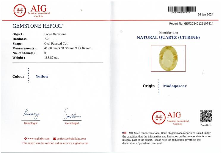 A loose oval shape Natural Citrine of 183.87ct. With AIG report #GEM20240126107814. Origin: Madagascar. (As new)