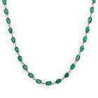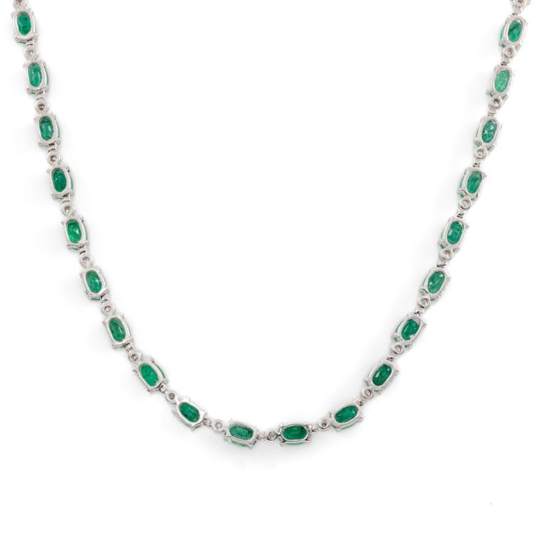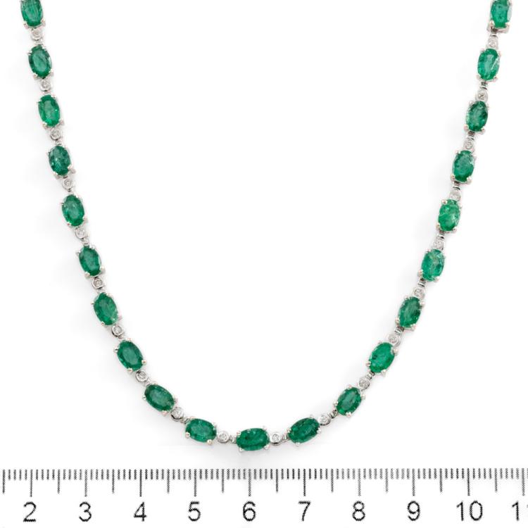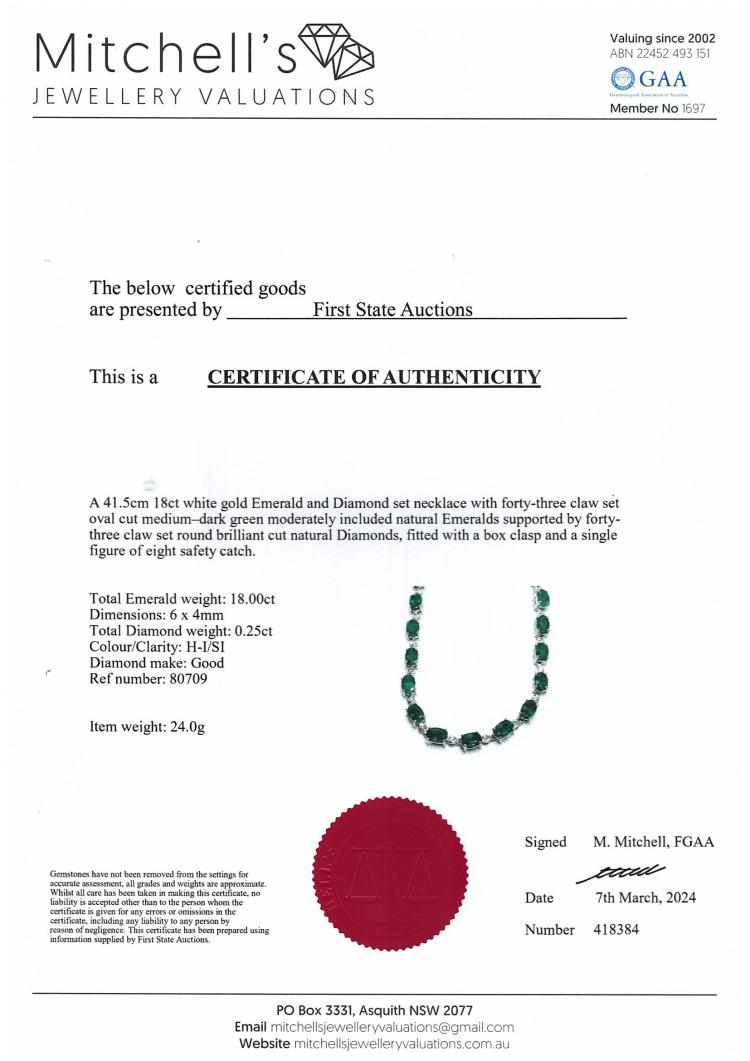 Emerald and Diamond necklace with oval shape Natural Emerald totalling 18.00cts and round Natural Diamonds totalling 0.25cts. 18ct white gold. Length: 41.5cm. Weight: 24.0g. With Certificate 418384. (Pre-owned)