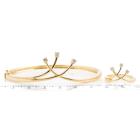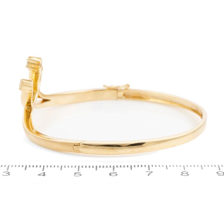 Matching Diamond bangle and ring set. Diamond dress ring with 3 round natural Diamonds totalling approximately 0.15ct. Ring size: M1/2. Band Width: 2.3mm - 2.7mm. And Matching Diamond oval bangle with 3 round natural Diamonds totalling approximately 0.30ct (Estimated grading: H SI). Circumference: 18cm. Width: 3.1mm - 2.1mm. Both 18ct yellow gold. Total weight: 28.0g. (Pre-Owned)