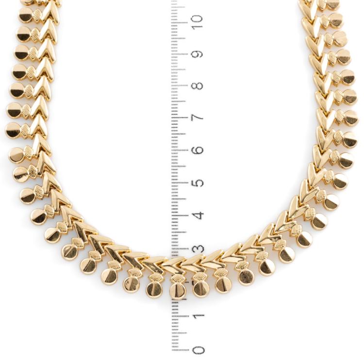 Gold Choker with hollow fancy links. 18ct yellow gold. Length: 44cm. Width: 1.3cm. Weight: 43.0g. With copy of GSL Valuation #AA 63603, Item 1. (Pre-owned)^