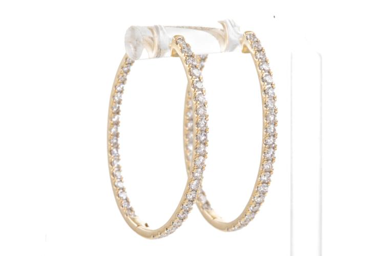 Diamond hoop earrings with 74 round Natural Diamonds totalling 1.98cts (Estimated grading: H SI). Back of the hoop has the Diamonds set inside the hoop. 14ct yellow gold. Width: 25.0mm. Length: 35.0mm. Weight: 6.4g. (New).
