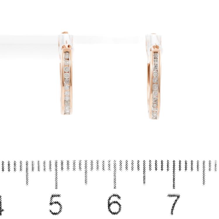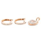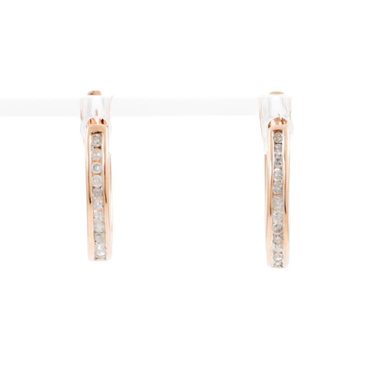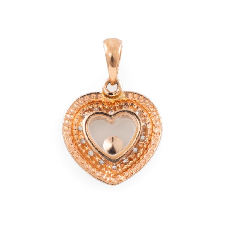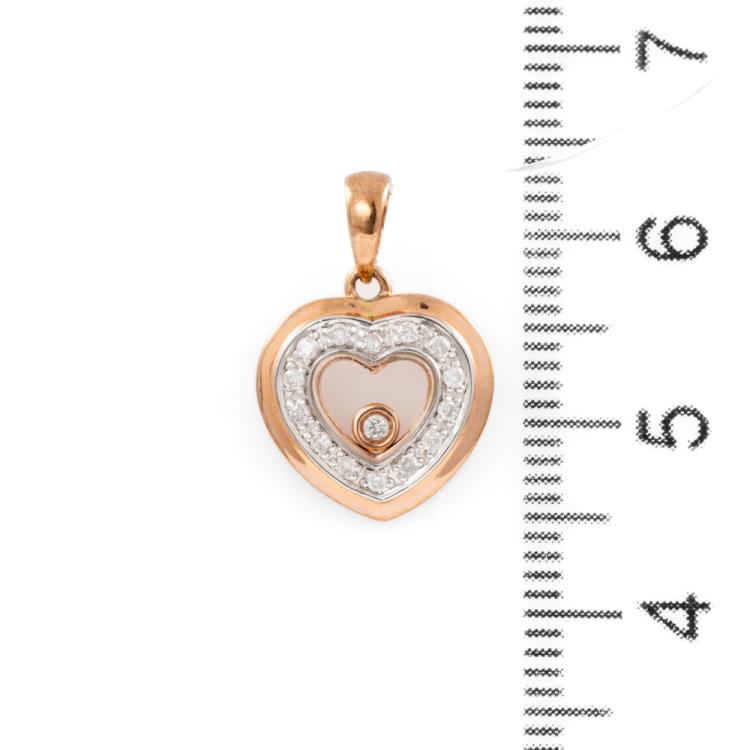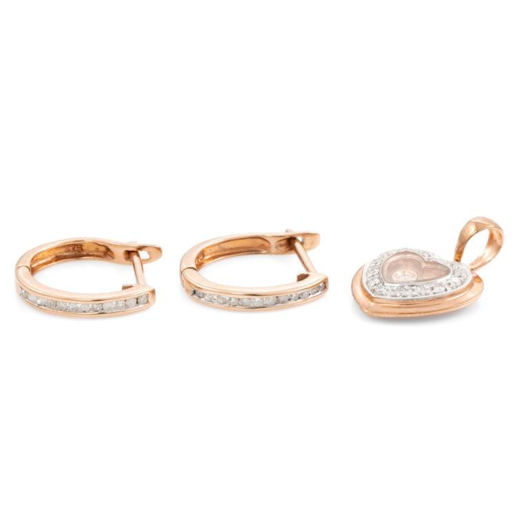 2 piece set: 1) Diamond huggie earrings with round natural Diamonds totalling 0.10cts. 9ct rose gold. 2) Diamond heart designed pendant with 14 round & 1 floating natural Diamonds totalling 0.10cts. 9ct rose gold and white gold. No chain provided. Combined weight: 2.4g. (As new)
