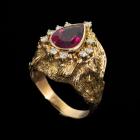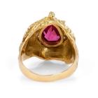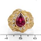 Garnet and Diamond ring with pear shape red Natural Garnet of approximately 2.00ct and round Natural Diamonds totalling approximately 0.20cts. 18ct yellow gold. Ring size M. Band width: 4.8mm - 2.8mm. Weight: 9.2g. (Pre-owned)