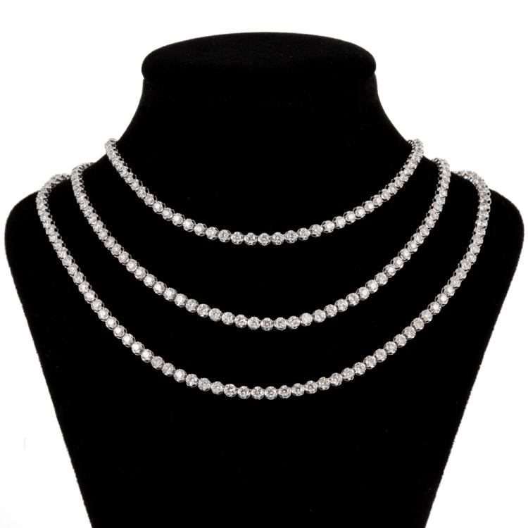Diamond three row tennis necklace with 432 round Natural Diamonds totalling 21.00cts (Estimated grading: H-I SI). 14ct white gold. Length: 40.0cm. Weight: 21.7g. With Certificate #418177. (New)