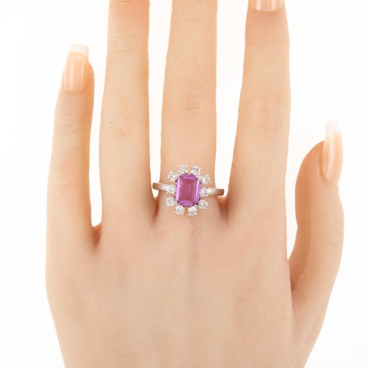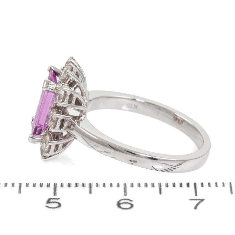 Sapphire and Diamond ring with an emerald cut pink natural Sapphire of 2.10ct and round natural Diamonds totalling 0.99cts (Estimated grading: K SI). 18ct white gold. Ring size P. Band width: 2.2mm-2.4mm. Weight: 6.2g. (New)