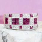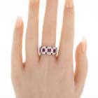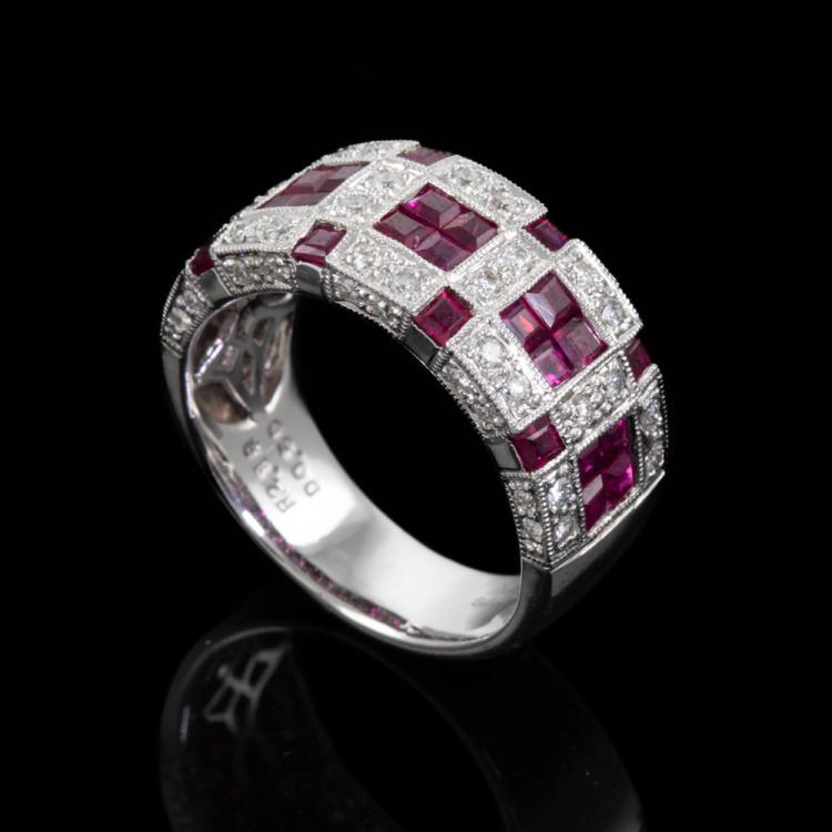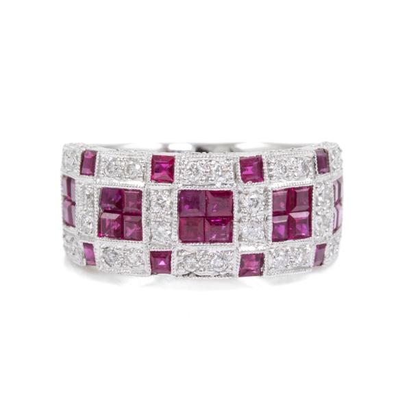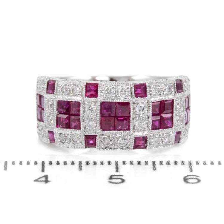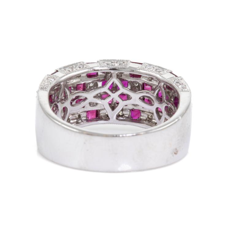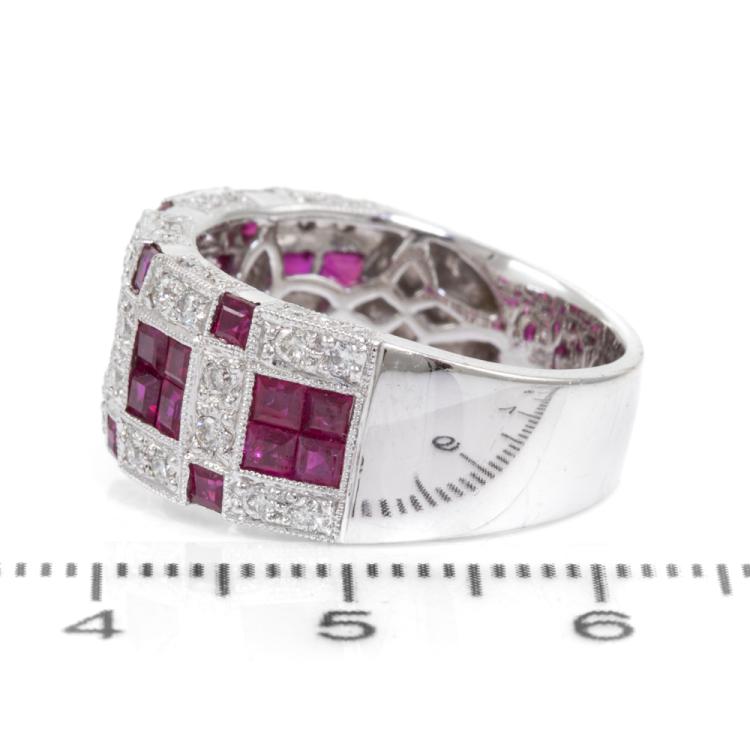 Ruby and Diamond ring with carre cut Rubies totalling 2.18cts and round Diamonds totalling 0.50cts (Estimated grading: G VS). 18ct white gold. Ring size N1/2. Band width: 5.8 - 8.7mm. Weight: 8.6g.
